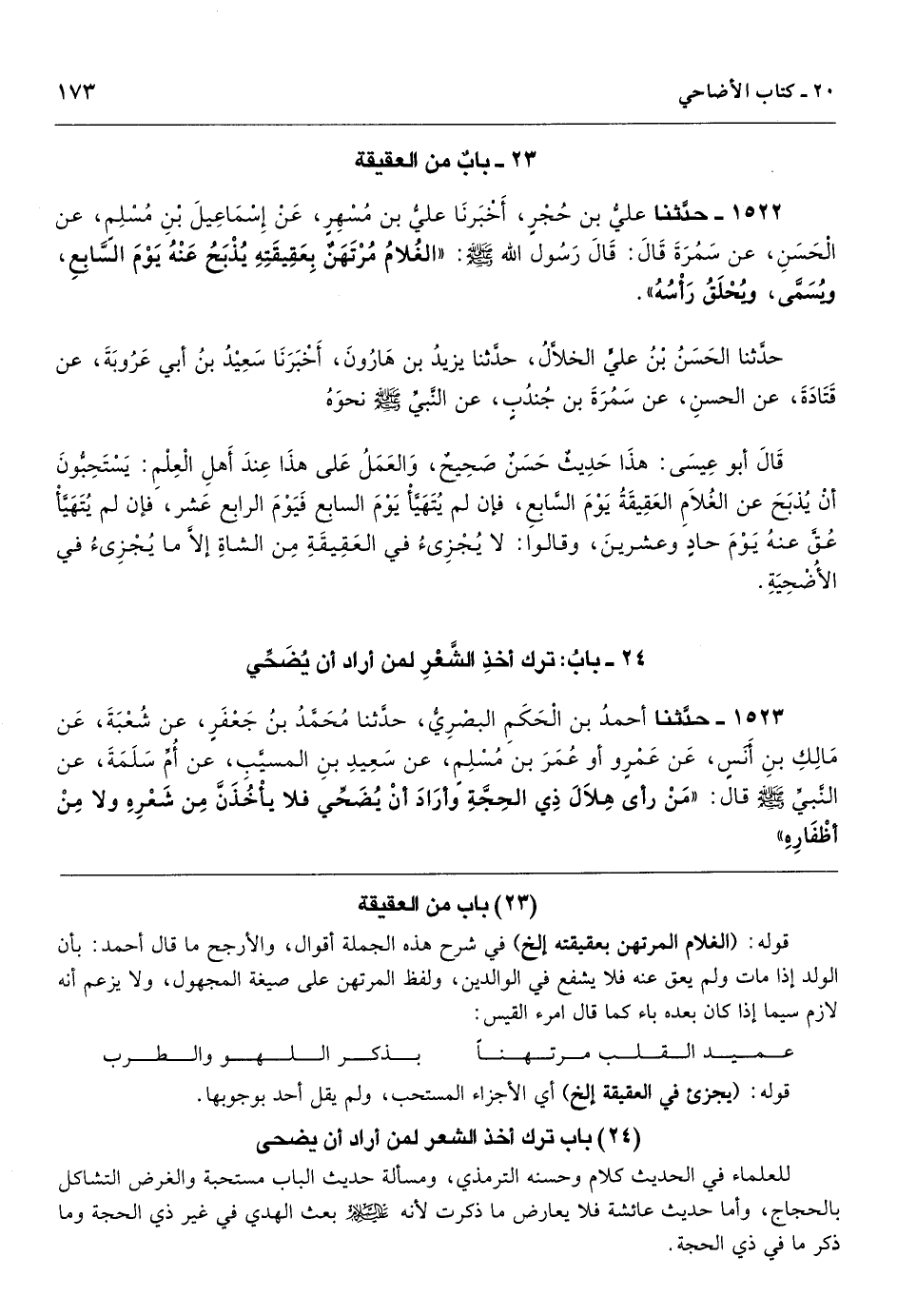 [1522] قوله: (الغلام المرتهن بعقيقته إلخ) في شرح هذه الجملة أقوال، والأرجح ما قال أحمد: بأن الولد إذا مات ولم يعق عنه فلا يشفع في الوالدين، ولفظ المرتهن على صيغة المجهول، ولا يزعم أنه لازم سيما إذا كان بعده باء كما قال امرء القيس: