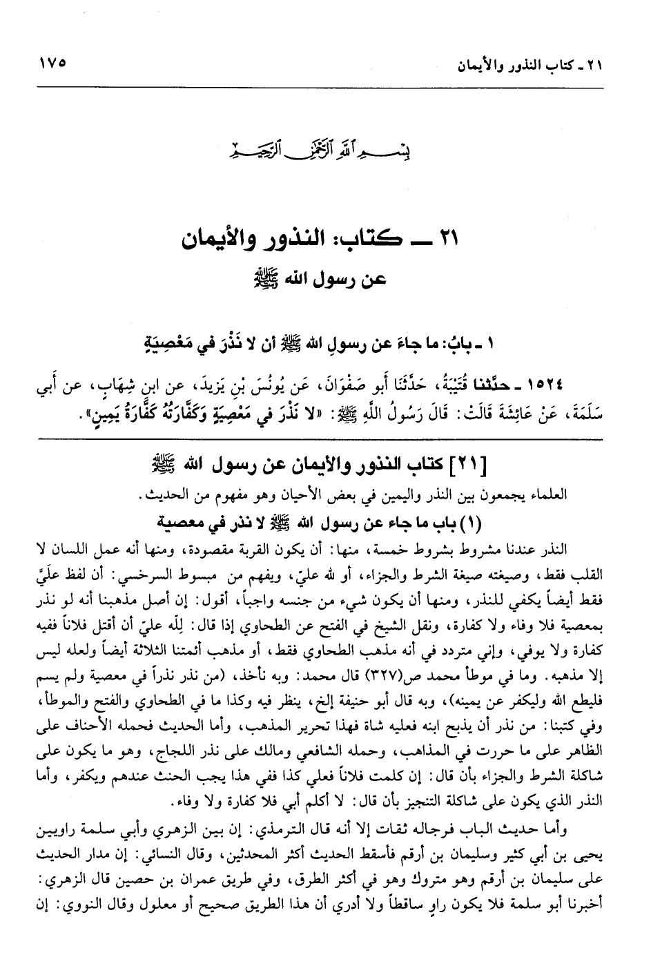 [1524] النذر عندنا مشروط بشروط خمسة، منها: أن يكون القربة مقصودة، ومنها أنه عمل اللسان لا القلب فقط، وصيغته صيغة الشرط والجزاء، أو لله عليّ، ويفهم من مبسوط السرخسي: أن لفظ علَيَّ فقط أيضاً يكفي للنذر، ومنها أن يكون شيء من جنسه واجباً، أقول: إن أصل مذهبنا أنه لو نذر بمعصية فلا وفاء ولا كفارة، ونقل الشيخ في الفتح عن الطحاوي إذا قال: لِلّه عليّ أن أقتل فلاناً ففيه كفارة ولا يوفي، وإني متردد في أنه مذهب الطحاوي فقط، أو مذهب أئمتنا الثلاثة أيضاً ولعله ليس إلا مذهبه. وما في موطأ محمد ص (327) قال محمد: وبه نأخذ، (من نذر نذراً في معصية ولم يسم فليطع الله وليكفر عن يمينه) ، وبه قال أبو حنيفة إلخ، ينظر فيه وكذا ما في الطحاوي والفتح والموطأ، وفي كتبنا: من نذر أن يذبح ابنه فعليه شاة فهذا تحرير المذهب، وأما الحديث فحمله الأحناف على الظاهر على ما حررت في المذاهب، وحمله الشافعي ومالك على نذر اللجاج، وهو ما يكون على شاكلة الشرط والجزاء بأن قال: إن كلمت فلاناً فعلي كذا ففي هذا يجب الحنث عندهم ويكفر، وأما النذر الذي يكون على شاكلة التنجيز بأن قال: لا أكلم أبي فلا كفارة ولا وفاء.
