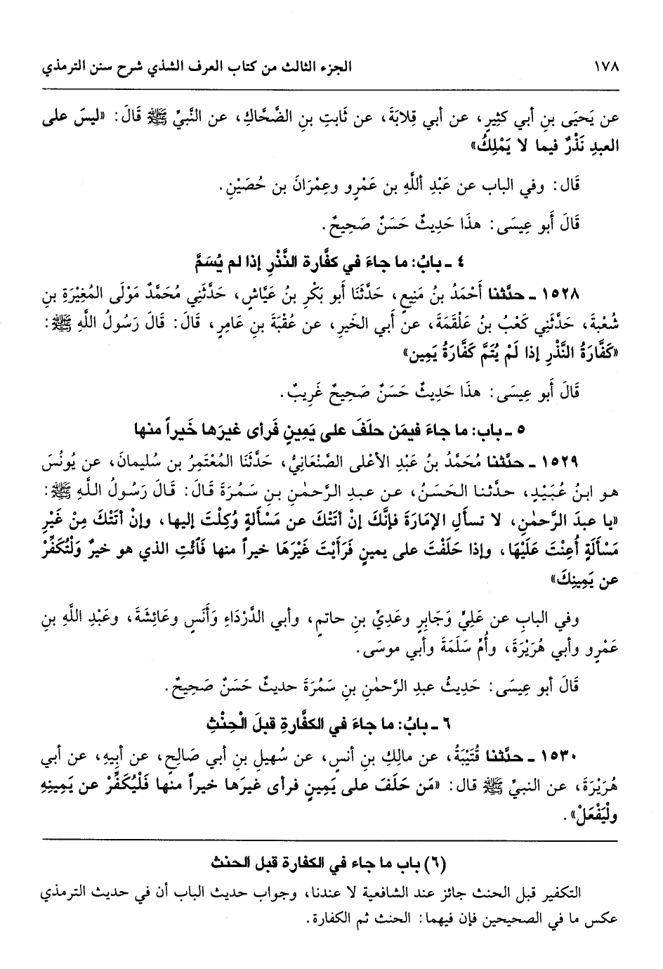 [1530] التكفير قبل الحنث جائز عند الشافعية لا عندنا، وجواب حديث الباب أن في حديث الترمذي عكس ما في الصحيحين فإن فيهما: الحنث ثم الكفارة.