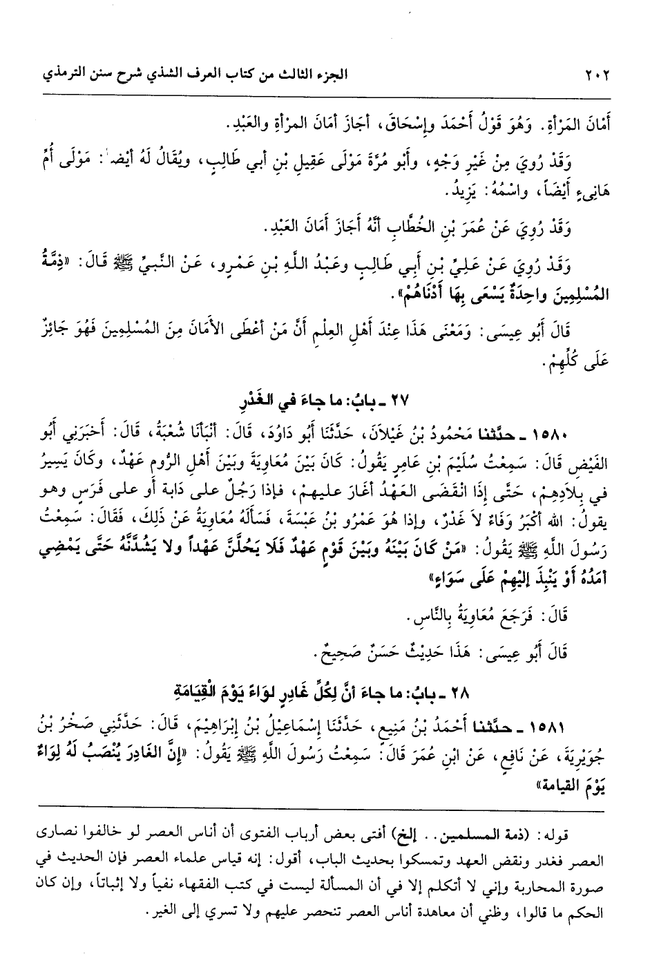 قوله: (ذمة المسلمين. . إلخ) أفتى بعض أرباب الفتوى أن أناس العصر لو خالفوا نصارى العصر فغدر ونقض العهد وتمسكوا بحديث الباب، أقول: إنه قياس علماء العصر فإن الحديث في صورة المحاربة وإني لا أتكلم إلا في أن المسألة ليست في كتب الفقهاء نفياً ولا إثباتاً، وإن كان الحكم ما قالوا، وظني أن معاهدة أناس العصر تنحصر عليهم ولا تسري إلى الغير.