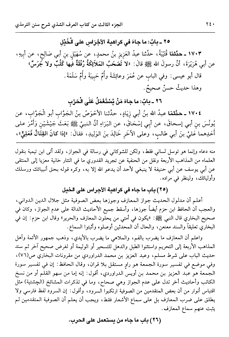 واعلم أن المعازف ما يضرب بالفم، والملاهي ما يضرب بالأيدي، وذهب جمهور الأئمة وأهل المذاهب الأربعة إلى التحريم واستثنوا الطبل والدهل للتسحير أو الوليمة أو لغرض صحيح آخر ثم سند حديث الباب على شرط مسلم، وعبد العزيز بن محمد الدراوردي من مقرونات البخاري ص (76) ، وفي موضع في تفسير سورة الجمعة هو راوٍ مستقل بلا قران، وقال الحافظ: إن في تفسير سورة الجمعة هو عبد العزيز بن محمد بن أويس الدراوردي، أقول: إنه إما من سهو القلم أو من نسخ الكاتب وأحاديث أخر تدل على عدم الجواز وهي صحاح، وما في تذكرات المشائخ (ال شتية) مثل اقتباس أنوار من أن بعض المتقدمين من الصوفية ارتكبوا السرود، وأقول: إن السرود لفظ فارسي ولا يطلق على ضرب المعازف بل على سماع الأشعار فقط، ويجب أن يعلم أن الصوفية المتقدمين لم يثبت عنهم سماع المعازف.