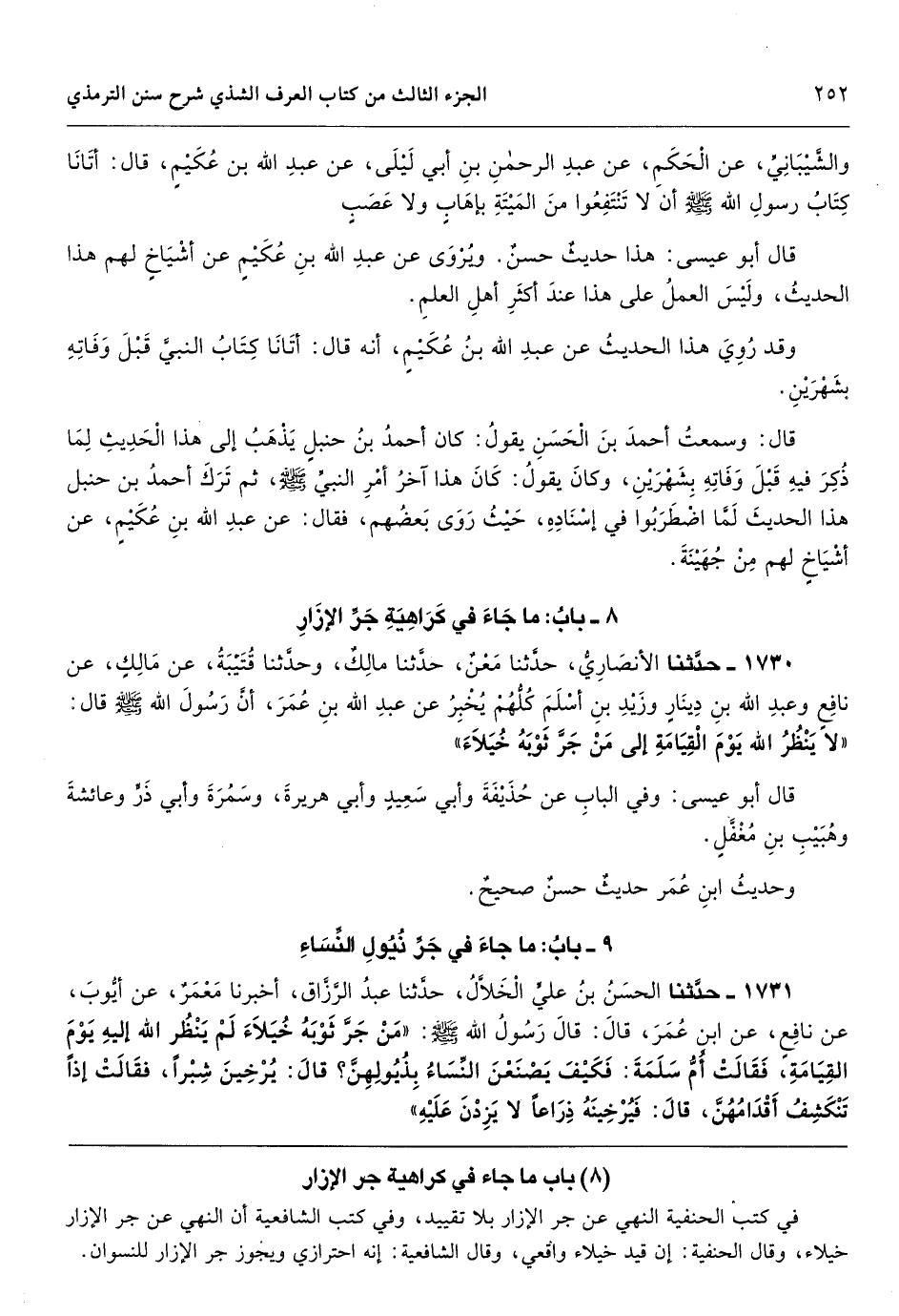 [1730] في كتب الحنفية النهي عن جر الإزار بلا تقييد، وفي كتب الشافعية أن النهي عن جر الإزار خيلاء، وقال الحنفية: إن قيد خيلاء واقعي، وقال الشافعية: إنه احترازي ويجوز جر الإزار للنسوان.