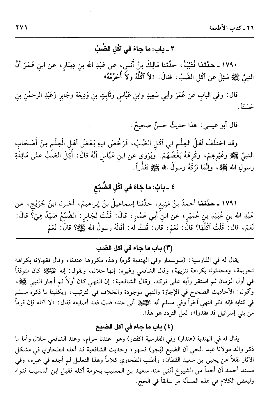 [1791] يقال له في الهندية (هندار) وفي الفارسية (كفتار) وهو عندنا حرام، وعند الشافعي حلال وأما ما ذكر والد مولانا عبد الحي أن الضبع (بّجو) فسهو، وحديث الشافعية قد أعله الطحاوي في مشكل الآثار نقلاً عن يحيى بن سعيد القطان، وأطنب الطحاوي كلاماً وهذا التعليل لم أجده في غيره، وفي مسند أحمد أن أحداً من الشيوخ أفتى عند سعيد بن المسيب بحرمة أكله فقبل ابن المسيب فتواه ولبعض الكلام في هذه المسألة مر سابقاً في الحج.