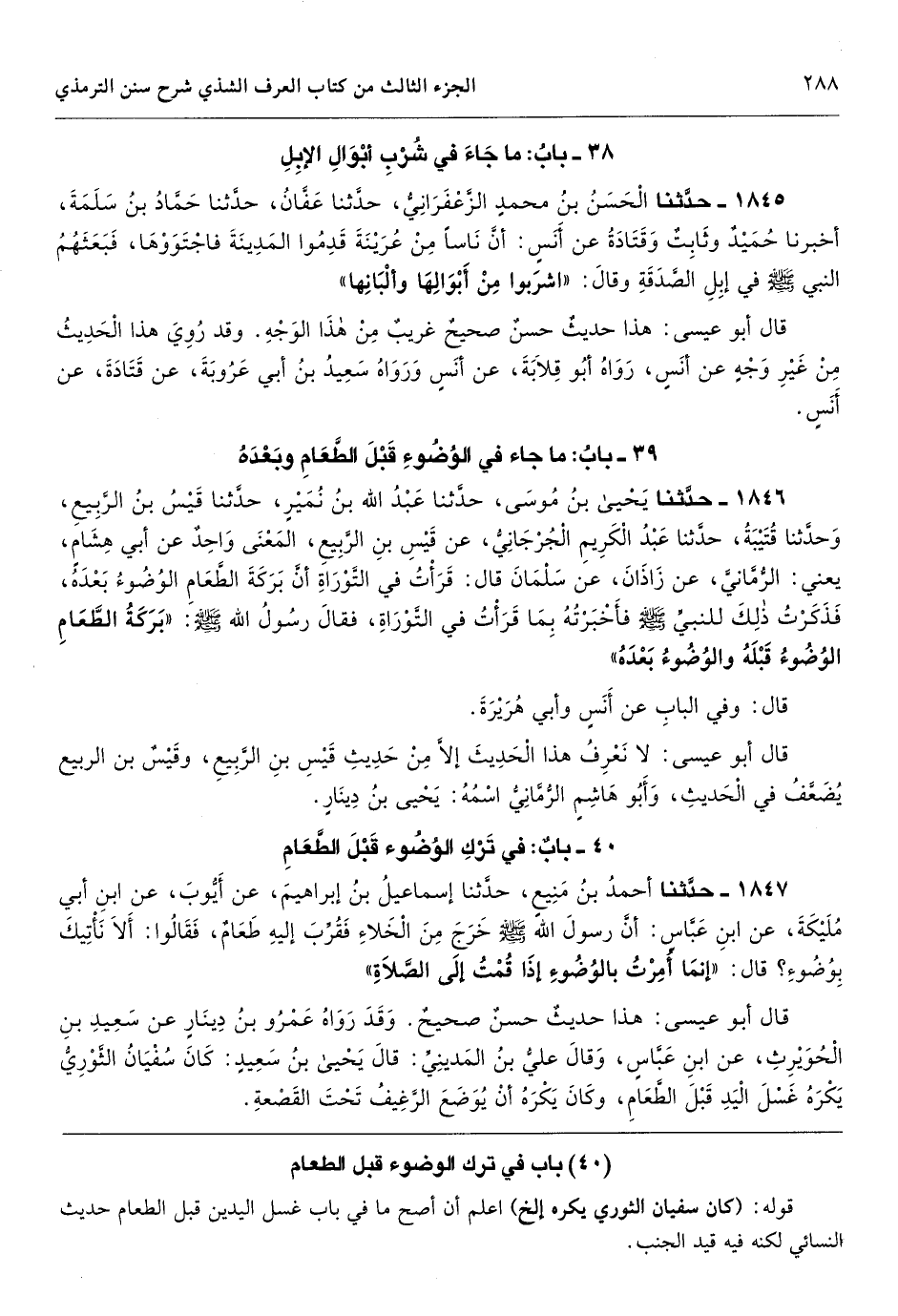 [1847] قوله: (كان سفيان الثوري يكره إلخ) اعلم أن أصح ما في باب غسل اليدين قبل الطعام حديث النسائي لكنه فيه قيد الجنب.