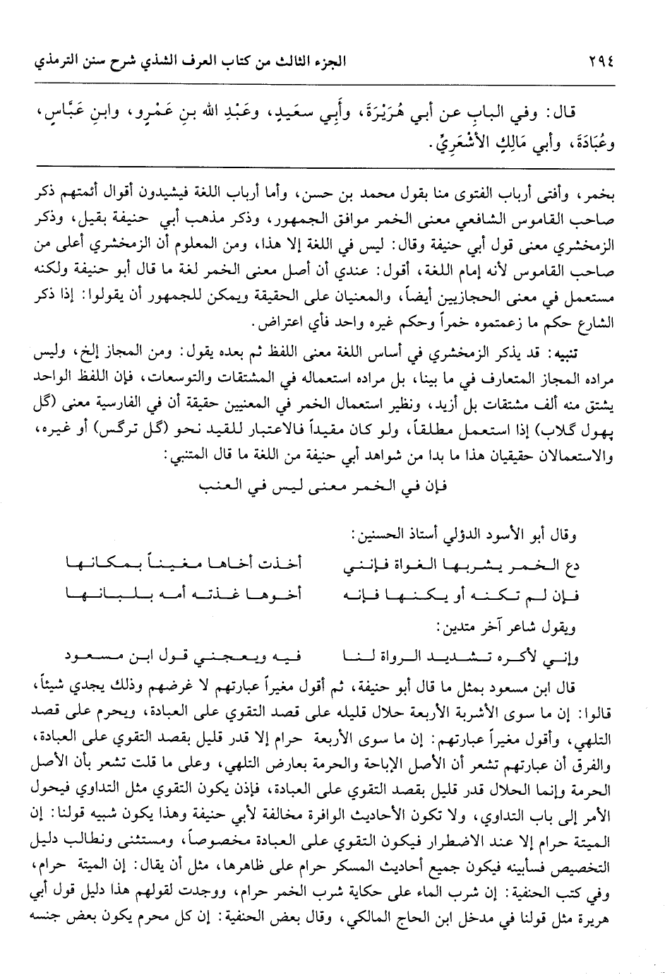 بخمر، وأفتى أرباب الفتوى منا بقول محمد بن حسن، وأما أرباب اللغة فيشيدون أقوال أئمتهم ذكر صاحب القاموس الشافعي معنى الخمر موافق الجمهور، وذكر مذهب أبي حنيفة بقيل، وذكر الزمخشري معنى قول أبي حنيفة وقال: ليس في اللغة إلا هذا، ومن المعلوم أن الزمخشري أعلى من صاحب القاموس لأنه إمام اللغة، أقول: عندي أن أصل معنى الخمر لغة ما قال أبو حنيفة ولكنه مستعمل في معنى الحجازيين أيضاً، والمعنيان على الحقيقة ويمكن للجمهور أن يقولوا: إذا ذكر الشارع حكم ما زعمتموه خمراً وحكم غيره واحد فأي اعتراض.
