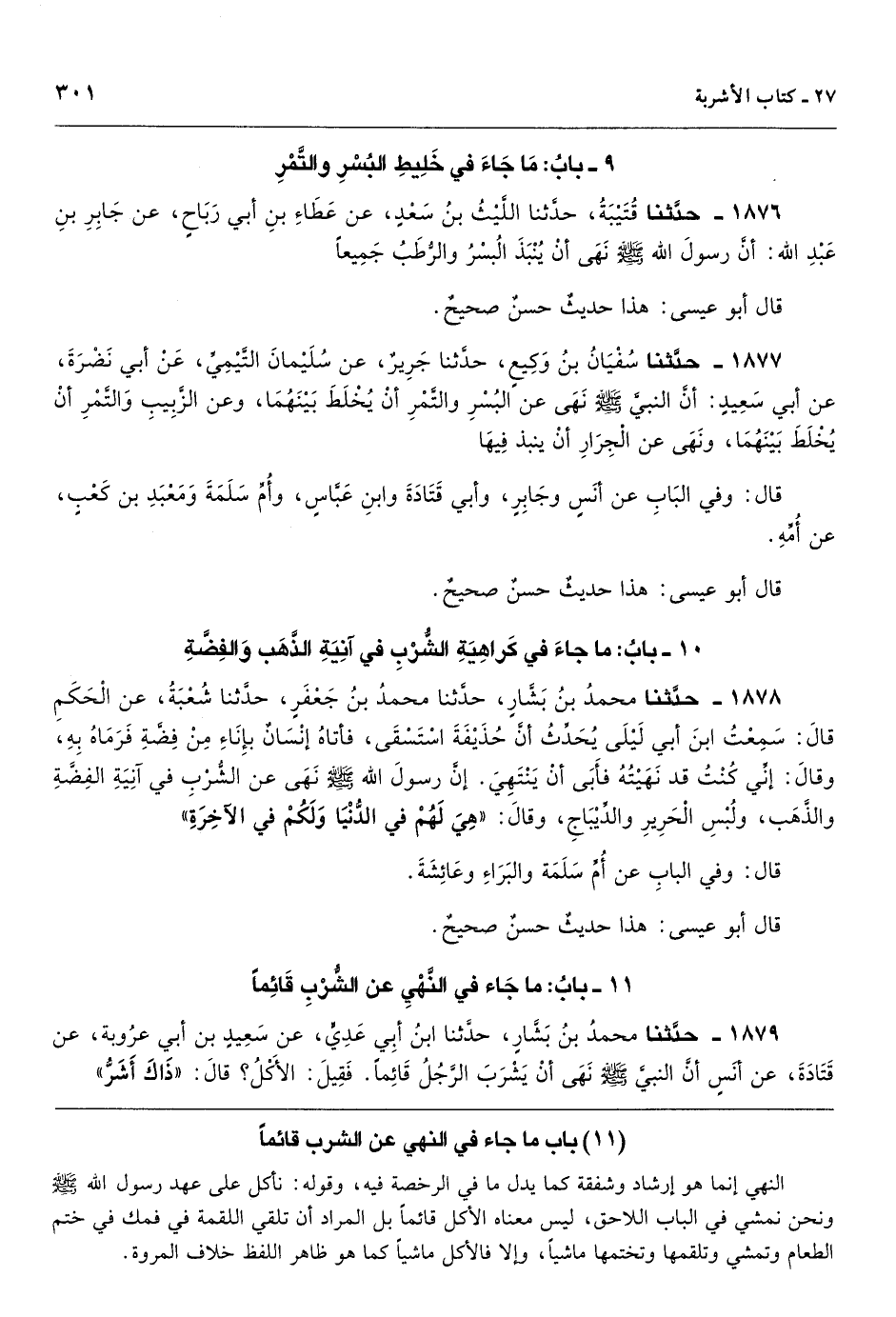 [1879] النهي إنما هو إرشاد وشفقة كما يدل ما في الرخصة فيه، وقوله: نأكل على عهد رسول الله - صَلَّى اللهُ عَلَيْهِ وَسَلَّمَ - ونحن نمشي في الباب اللاحق، ليس معناه الأكل قائماً بل المراد أن تلقي اللقمة في فمك في ختم الطعام وتمشي وتلقمها وتختمها ماشياً، وإلا فالأكل ماشياً كما هو ظاهر اللفظ خلاف المروة.