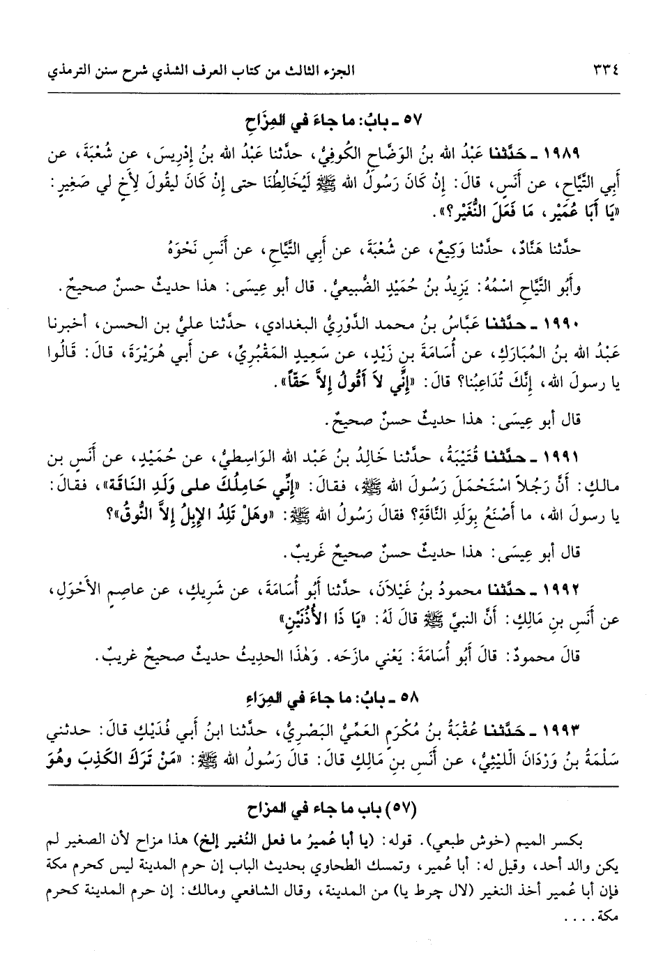 [1989] بكسر الميم (خوش طبعي) . قوله: (يا أبا عُميرُ ما فعل النُغير إلخ) هذا مزاح لأن الصغير لم يكن والد أحد، وقيل له: أبا عُمير، وتمسك الطحاوي بحديث الباب إن حرم المدينة ليس كحرم مكة فإن أبا عُمير أخذ النغير (لال رط يا) من المدينة، وقال الشافعي ومالك: إن حرم المدينة كحرم مكة. . . .
