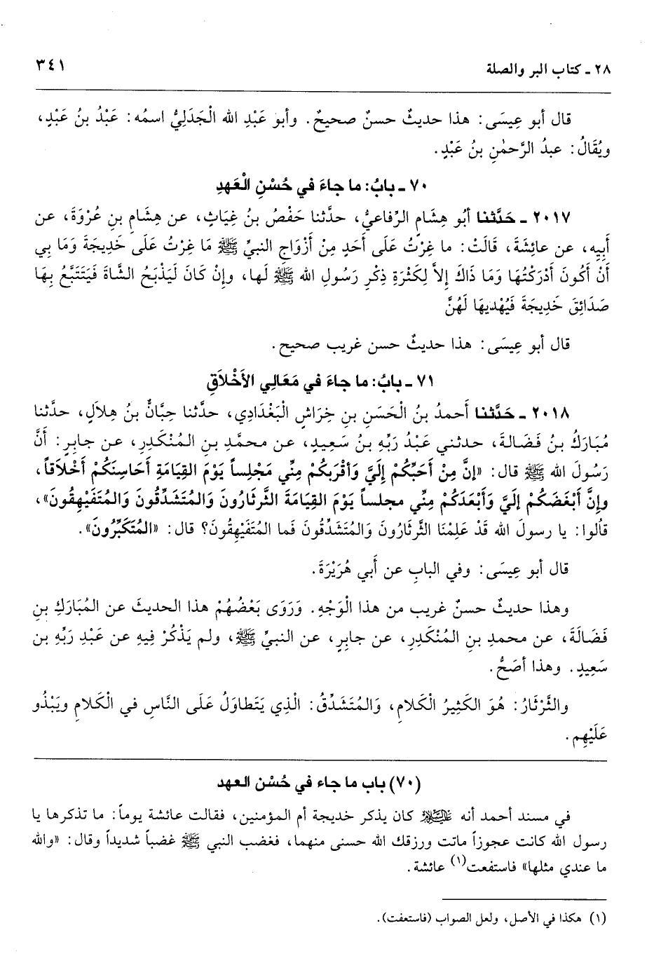 [2017] في مسند أحمد أنه كان يذكر خديجة أم المؤمنين، فقالت عائشة يوماً: ما تذكرها يا رسول الله كانت عجوزاً ماتت ورزقك الله حسنى منهما، فغضب النبي - صَلَّى اللهُ عَلَيْهِ وَسَلَّمَ - غضباً شديداً وقال: «والله ما عندي مثلها» فاستفعت عائشة.