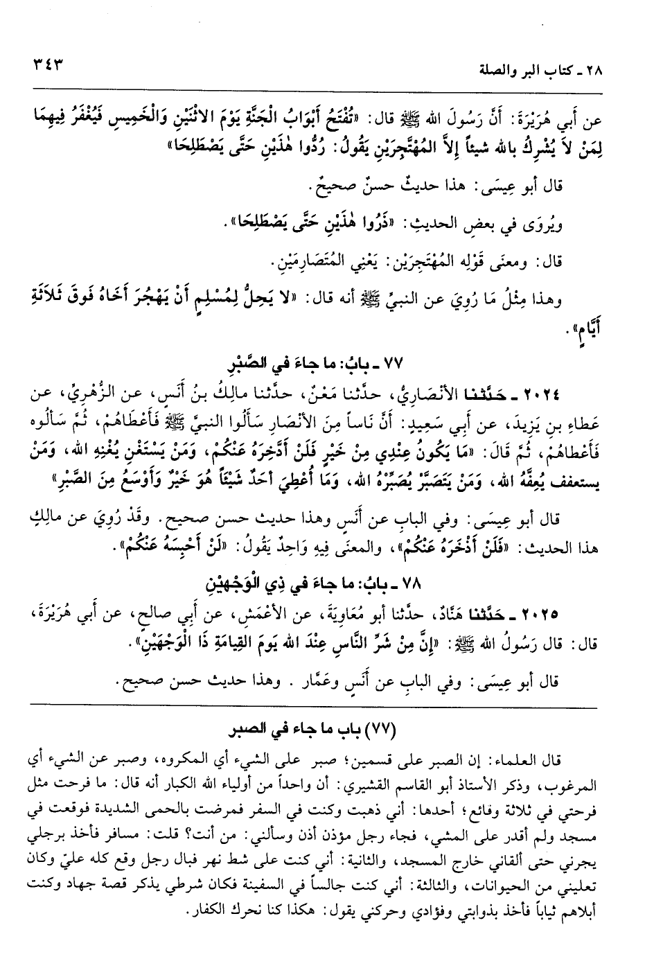 [2024] قال العلماء: إن الصبر على قسمين؛ صبر على الشيء أي المكروه، وصبر عن الشيء أي المرغوب، وذكر الأستاذ أبو القاسم القشيري: أن واحداً من أولياء الله الكبار أنه قال: ما فرحت مثل فرحتي في ثلاثة وقائع؛ أحدها: أني ذهبت وكنت في السفر فمرضت بالحمى الشديدة فوقعت في مسجد ولم أقدر على المشي، فجاء رجل مؤذن أذن وسألني: من أنت؟ قلت: مسافر فأخذ برجلي يجرني حتى ألقاني خارج المسجد، والثانية: أني كنت على شط نهر فبال رجل وقع كله عليّ وكان تعليني من الحيوانات، والثالثة: أني كنت جالساً في السفينة فكان شرطي يذكر قصة جهاد وكنت أبلاهم ثياباً فأخذ بذوابتي وفؤادي وحركني يقول: هكذا كنا نحرك الكفار.