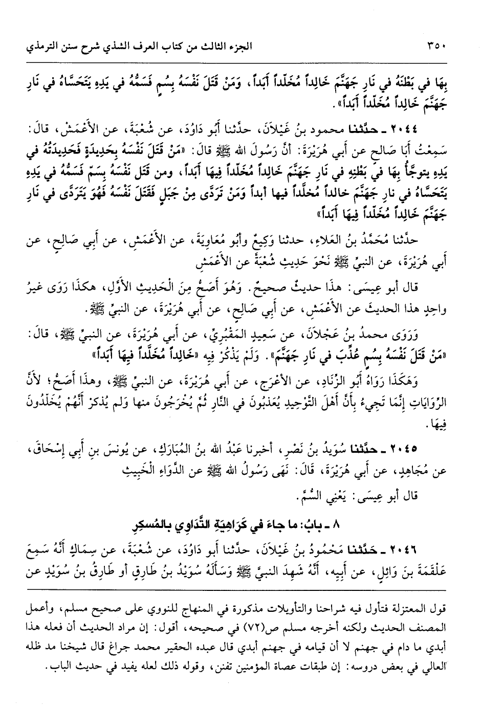 قول المعتزلة فتأول فيه شراحنا والتأويلات مذكورة في المنهاج للنووي على صحيح مسلم، وأعمل المصنف الحديث ولكنه أخرجه مسلم ص (72) في صحيحه، أقول: إن مراد الحديث أن فعله هذا أبدي ما دام في جهنم لا أن قيامه في جهنم أبدي قال عبده الحقير محمد جراغ قال شيخنا مد ظله العالي في بعض دروسه: إن طبقات عصاة المؤمنين تفنن، وقوله ذلك لعله يفيد في حديث الباب.