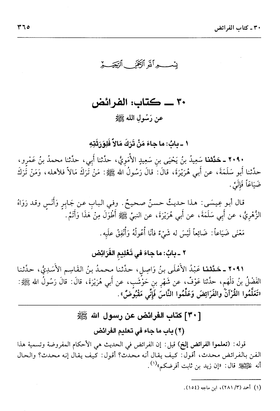 [2091] قوله: (تعلموا الفرائض إلخ) قيل: إن الفرائض في الحديث هي الأحكام المفروضة وتسمية هذا الفن بالفرائض محدث، أقول: كيف يقال أنه محدث؟ أقول: كيف يقال إنه محدث؟ والحال أنه قال: «إن زيد بن ثابت أفرضكم» .