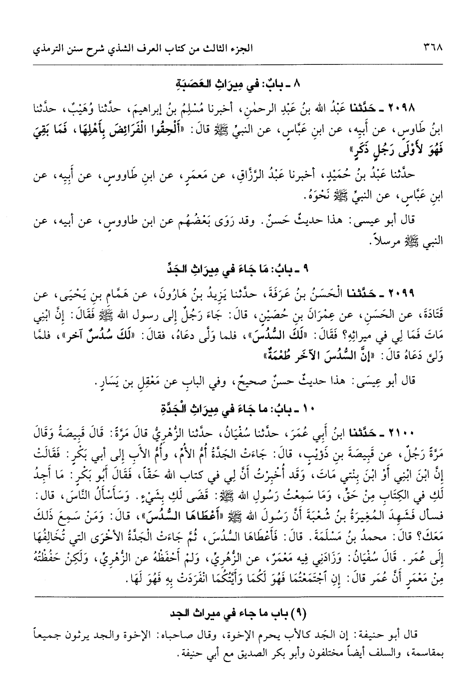 [2099] قال أبو حنيفة: إن الجَد كالأب يحرم الإخوة، وقال صاحباه: الإخوة والجد يرثون جميعاً بمقاسمة، والسلف أيضاً مختلفون وأبو بكر الصديق مع أبي حنيفة.