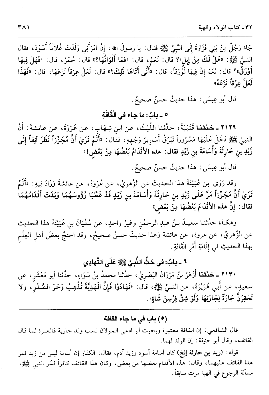 قوله: (زيد بن حارثة إلخ) كان أسامة أسود وزيد آدم، فقال: الكفار إن أسامة ليس من زيد فمر هذا القائف عليهما، وقال: هذه الأقدام بعضها من بعض، وكان هذا القائف كافراً فسُر النبي - صَلَّى اللهُ عَلَيْهِ وَسَلَّمَ -، مسألة الرجوع في الهبة مرت سابقاً.