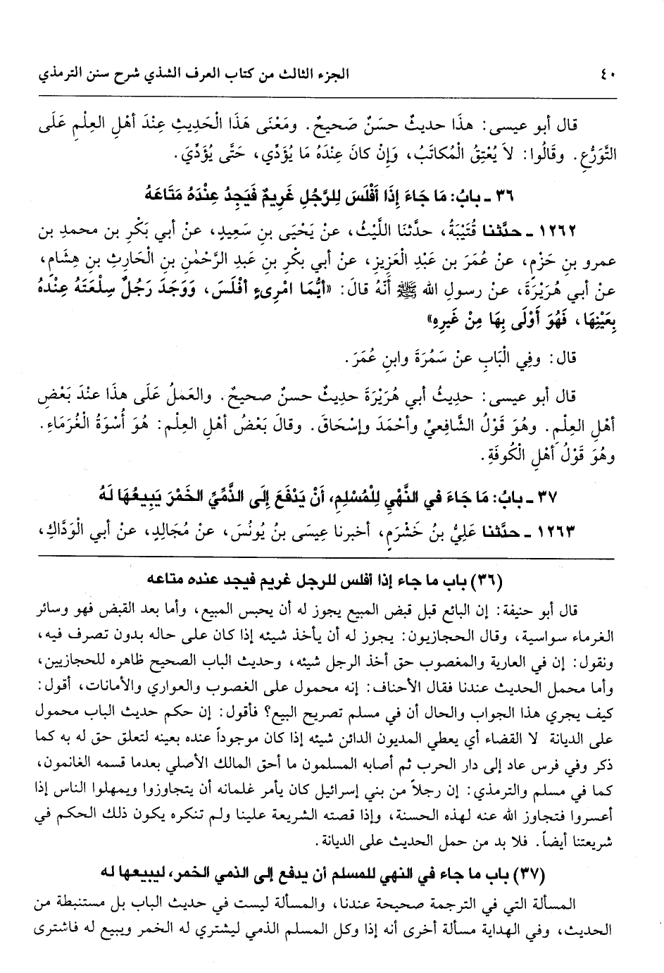 [1262] قال أبو حنيفة: إن البائع قبل قبض المبيع يجوز له أن يحبس المبيع، وأما بعد القبض فهو وسائر الغرماء سواسية، وقال الحجازيون: يجوز له أن يأخذ شيئه إذا كان على حاله بدون تصرف فيه، ونقول: إن في العارية والمغصوب حق أخذ الرجل شيئه، وحديث الباب الصحيح ظاهره للحجازيين، وأما محمل الحديث عندنا فقال الأحناف: إنه محمول على الغصوب والعواري والأمانات، أقول: كيف يجري هذا الجواب والحال أن في مسلم تصريح البيع؟ فأقول: إن حكم حديث الباب محمول على الديانة لا القضاء أي يعطي المديون الدائن شيئه إذا كان موجوداً عنده بعينه لتعلق حق له به كما ذكر وفي فرس عاد إلى دار الحرب ثم أصابه المسلمون ما أحق المالك الأصلي بعدما قسمه الغانمون، كما في مسلم والترمذي: إن رجلاً من بني إسرائيل كان يأمر غلمانه أن يتجاوزوا ويمهلوا الناس إذا أعسروا فتجاوز الله عنه لهذه الحسنة، وإذا قصته الشريعة علينا ولم تنكره يكون ذلك الحكم في شريعتنا أيضاً. فلا بد من حمل الحديث على الديانة.