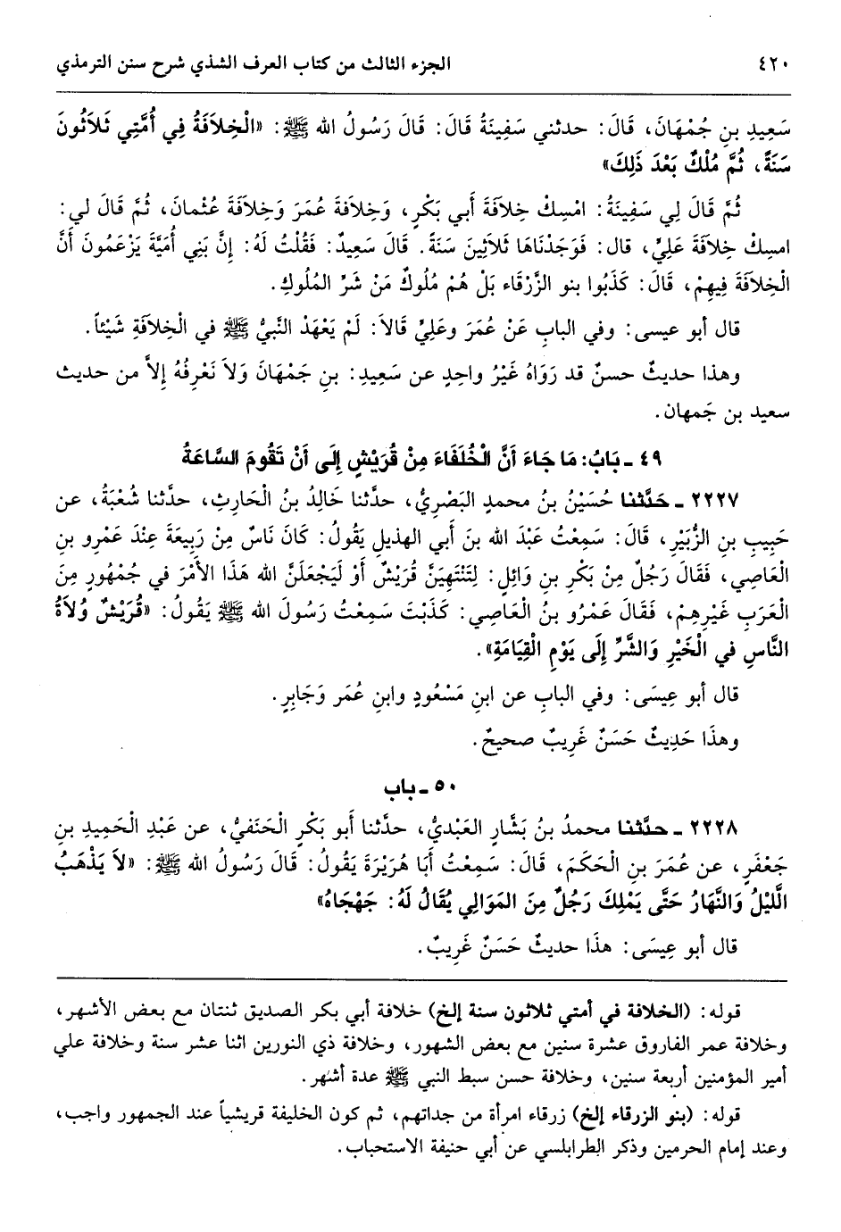 [2225] قوله: (الخلافة في أمتي ثلاثون سنة إلخ) خلافة أبي بكر الصديق ثنتان مع بعض الأشهر، وخلافة عمر الفاروق عشرة سنين مع بعض الشهور، وخلافة ذي النورين اثنا عشر سنة وخلافة علي أمير المؤمنين أربعة سنين، وخلافة حسن سبط النبي - صَلَّى اللهُ عَلَيْهِ وَسَلَّمَ - عدة أشهر.