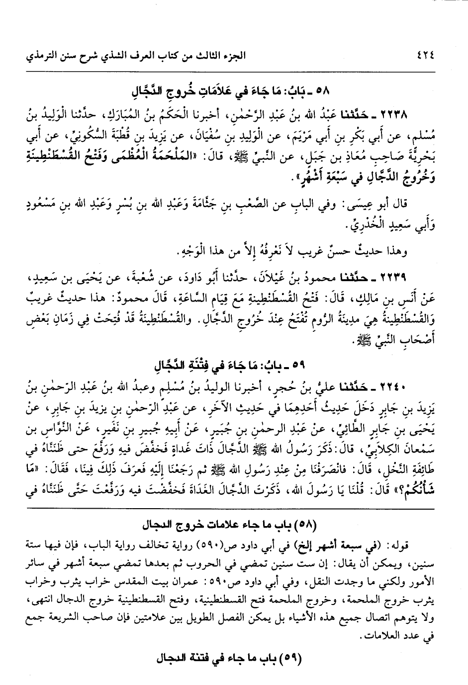 [2238] قوله: (في سبعة أشهر إلخ) في أبي داود ص (590) رواية تخالف رواية الباب، فإن فيها ستة سنين، ويمكن أن يقال: إن ست سنين تمضي في الحروب ثم بعدها تمضي سبعة أشهر في سائر الأمور ولكني ما وجدت النقل، وفي أبي داود ص590: عمران بيت المقدس خراب يثرب وخراب يثرب خروج الملحمة، وخروج الملحمة فتح القسطنطينية، وفتح القسطنطينية خروج الدجال انتهى، ولا يتوهم اتصال جميع هذه الأشياء بل يمكن الفصل الطويل بين علامتين فإن صاحب الشريعة جمع في عدد العلامات.