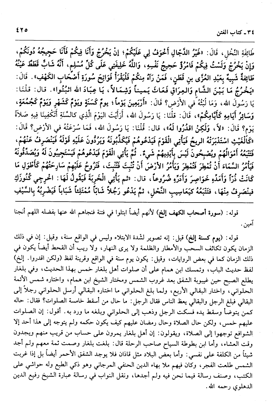 قوله: (يوم كسنة إلخ) قيل: إنه تصوير لشّدة الابتلاء وليس في الواقع سنة، وقيل: إن في ذلك الزمان يكون تكاثف السحب والأمطار والظلمة ولا يرى النهار، ولا ريب أن القحط أيضاً يكون في ذلك الزمان كما في بعض الروايات، وقيل: يكون يوم سنة في الواقع وقرينة لفظ (ولكن اقدروا. إلخ) لفظ حديث الباب، وتمسك ابن همام على أن صلوات أهل بلغار خمس بهذا الحديث، وفي بلغار يطلع الصبح حين غيبوبة الشفق بعد غروب الشمس ومختار الشيخ ابن همام، واختاره شمس الأئمة الحلواني، واختار البقالي الأربع، ولما بلغ الحلواني ما اختاره البقالي أرسل الحلواني رجلاً إلى البقالي فبلغ الرجل والبقالي يعظ الناس فقال الرجل: ما حال من أسقط خامسة الصلوات؟ فقال: حاله كمن يتوضأ وسقط يده فسكت الرجل وذهب إلى الحلواني وبلغه ما ورد به. أقول: إن الصلوات عليهم خمس، ولكن حال الصلاة وحال رمضان عليهم كيف يكون حكمه ولم يتوجه إلى هذا أحد إلا الشوافع توجهوا إلى الصلاة، ويقولون: إن أهل بلغار يمرون على حساب من قريب منهم ويجدون وقت العشاء، وأما ابن بطوطة السياح صاحب الرحلة قال: بلغت بلغار وصمت ثمة معهم ولم أجد شيئاً من الكلفة على نفسي: وأما بعض البلاد مثل قاذان فلا يوجد الشفق الأحمر أيضاً بل إذا غربت الشمس طلعت الفجر، وكان فيهم ملا بهاء الدين الحنفي المرجاني وهو ذكي الطبع وله حواشي على الكتب، وصنف رسالة فيما نحن فيه ولم أجدها، ونقل النواب في رسالة عبارة الشيخ رفيع الدين الدهلوي رحمه الله.