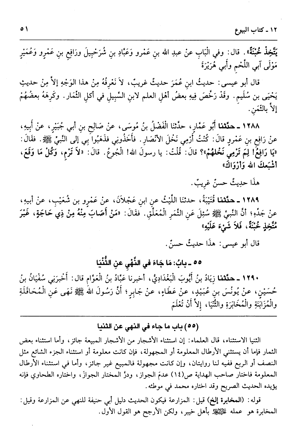 [1290] الثنيا الاستثناء، قال العلماء: إن استثناء الأشجار من الأشجار المبيعة جائز، وأما استثناء بعض الثمار فإما أن يستثني الأرطال المعلومة أو المجهولة، فإن كانت معلومة أو استثناء الجزء الشائع مثل النصف أو الربع ففيه لنا روايتان، وإن كانت مجهولة فالمبيع غير جائز، وأما في استثناء الأرطال المعلومة فاختار صاحب الهداية ص (14) عدمَ الجواز، ودرُّ المختار الجوازَ، واختاره الطحاوي فإنه يؤيده الحديث الصريح وقد اختاره محمد في موطئه.
