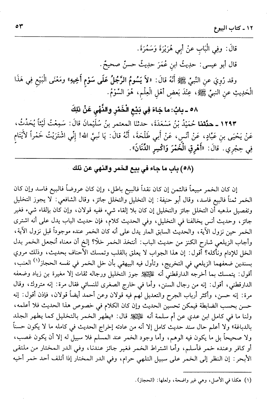 [1293] إن كان الخمر مبيعاً فالثمن إن كان نقداً فالبيع باطل، وإن كان عروضاً فالبيع فاسد وإن كان الخمر ثمناً فالبيع فاسد، وقال أبو حنيفة: إن التخليل والتخلل جائز، وقال الشافعي: لا يجوز التخليل وتفصيل مذهبه أن التخلل جائز والتخليل إن كان بلا إلقاء شيء ففيه قولان، وإن كان بإلقاء شيء فغير جائز، وحديث أنس يخالفنا في التخليل، وفي الحديث كلام، فإن حديث الباب يدل على أنه اشترى الخمر حين نزول الآية، والحديث السابق المار يدل على أنه كان الخمر عنده موجوداً قبل نزول الآية، وأجاب الزيلعي شارح الكنز من حديث الباب: أنتخذ الخمر خلاّ؟ إلخ أن معناه أنجعل الخمر بدل الخل للإدام ونأكله؟ أقول: إن هذا الجواب لا يعلق بالقلب وتمسك الأحناف بحديث، وذلك مروي بسندين ضعفهما الزيلعي في التخريج، وتأول فيه البيهقي بأن خل الخمر في نفسه الحجاز العنب، أقول: يتمسك بما أخرجه الدارقطني أنه جوز التخليل ورجاله ثقات إلا مغيرة بن زياد وضعفه الدارقطني، أقول: إنه من رجال السنن، وأما في خارج الصغرى للنسائي فقال مرة: إنه متروك، وقال مرة: إنه حسن، وأكثر أرباب الجرح والتعديل لهم فيه قولان وعن أحمد أيضاً قولان، فإذن أقول: إنه حسن بحسب الضابطة فيمكن تحسين الحديث وإن كان الكلام في خصوص هذا الحديث فلا أعلمه، ولنا ما في كامل ابن عدي عن أم سلمة أنه قال: «يطهر الخمر بالتخليل كما يطهر الجلد بالدباغة» ولا أعلم حال سند حديث كامل إلا أنه من عادته إخراج الحديث في كامله ما لا يكون حسناً ولا صحيحاً بل ما يكون فيه الوهم، وأما وجود الخمر عند المسلم فلا سبيل له إلا أن يكون غصب، أو كافر وعنده خمر فأسلم، وأما اشتراط الخمر فغير جائز عندنا، وفي الدر المختار من ملتقى الأبحر: إن النظر إلى الخمر على سبيل التلهي حرام، وفي الدر المختار إذا أتلف أحد خمر أخيه
