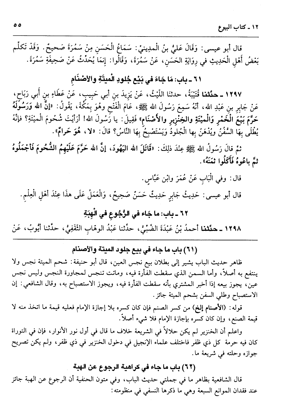 [1297] ظاهر حديث الباب يشير إلى بطلان بيع نجس العين، قال أبو حنيفة: شحم الميتة نجس ولا ينتفع به أصلاً، وأما السمن الذي سقطت الفأرة فيه، وماتت تنجس لمجاورة النجس وليس نجس عين، يجوز بيعه إذا أخبر المشتري بأنه سقطت الفأرة فيه، ويجوز الاستصباح به، وقال الشافعي: إن الاستصباح وطلي السفن بشحم الميتة جائز.