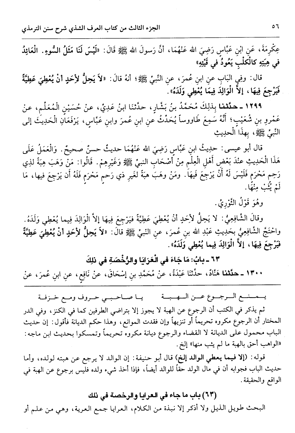 ثم يذكر في الكتب أن الرجوع عن الهبة لا يجوز إلا بتراضي الطرفين كما في الكنز، وفي الدر المختار أن الرجوع مكروه تحريماً أو تنزيهاً وإن فقدت الموانع، وهذا حكم الديانة فأقول: إن حديث الباب محمول على الديانة لا القضاء والرجوع ديانة مكروه تحريماً وتمسكوا بحديث ابن ماجه: «الواهب أحق بالهبة ما لم يثب منها» إلخ.