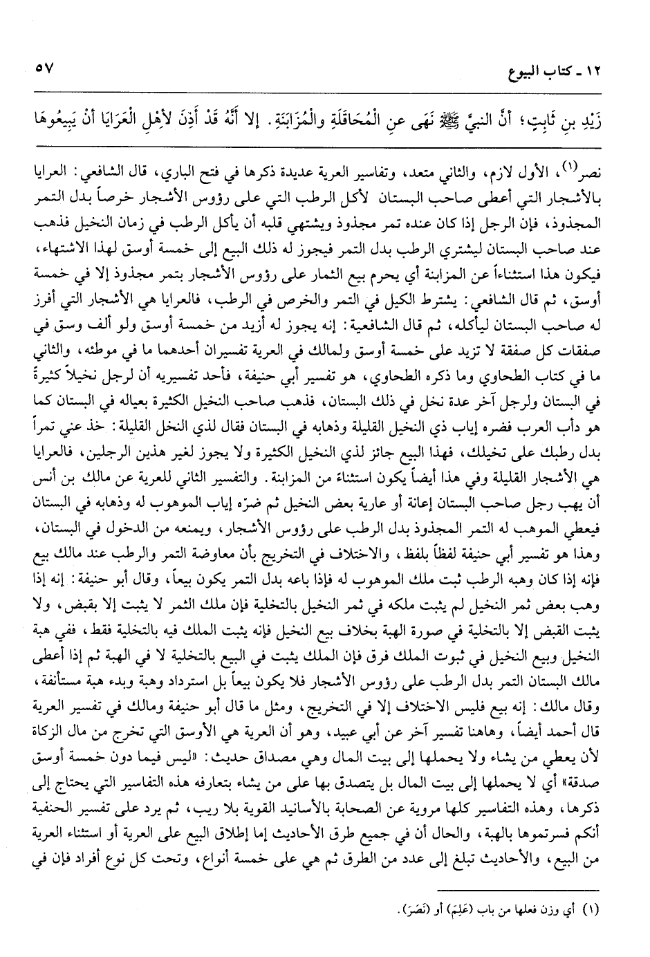 نصر، الأول لازم، والثاني متعد، وتفاسير العرية عديدة ذكرها في فتح الباري، قال الشافعي: العرايا بالأشجار التي أعطى صاحب البستان لأكل الرطب التي على رؤوس الأشجار خرصاً بدل التمر المجذوذ، فإن الرجل إذا كان عنده تمر مجذوذ ويشتهي قلبه أن يأكل الرطب في زمان النخيل فذهب عند صاحب البستان ليشتري الرطب بدل التمر فيجوز له ذلك البيع إلى خمسة أوسق لهذا الاشتهاء، فيكون هذا استثناءاً عن المزابنة أي يحرم بيع الثمار على رؤوس الأشجار بتمر مجذوذ إلا في خمسة أوسق، ثم قال الشافعي: يشترط الكيل في التمر والخرص في الرطب، فالعرايا هي الأشجار التي أفرز له صاحب البستان ليأكله، ثم قال الشافعية: إنه يجوز له أزيد من خمسة أوسق ولو ألف وسق في صفقات كل صفقة لا تزيد على خمسة أوسق ولمالك في العرية تفسيران أحدهما ما في موطئه، والثاني ما في كتاب الطحاوي وما ذكره الطحاوي، هو تفسير أبي حنيفة، فأحد تفسيريه أن لرجل نخيلاً كثيرةً في البستان ولرجل آخر عدة نخل في ذلك البستان، فذهب صاحب النخيل الكثيرة بعياله في البستان كما هو دأب العرب فضره إياب ذي النخيل القليلة وذهابه في البستان فقال لذي النخل القليلة: خذ عني تمراً بدل رطبك على تخيلك، فهذا البيع جائز لذي النخيل الكثيرة ولا يجوز لغير هذين الرجلين، فالعرايا هي الأشجار القليلة وفي هذا أيضاً يكون استثناءً من المزابنة. والتفسير الثاني للعرية عن مالك بن أنس أن يهب رجل صاحب البستان إعانة أو عارية بعض النخيل ثم ضرّه إياب الموهوب له وذهابه في البستان فيعطي الموهب له التمر المجذوذ بدل الرطب على رؤوس الأشجار، ويمنعه من الدخول في البستان، وهذا هو تفسير أبي حنيفة لفظاً بلفظ، والاختلاف في التخريج بأن معاوضة التمر والرطب عند مالك بيع فإنه إذا كان وهبه