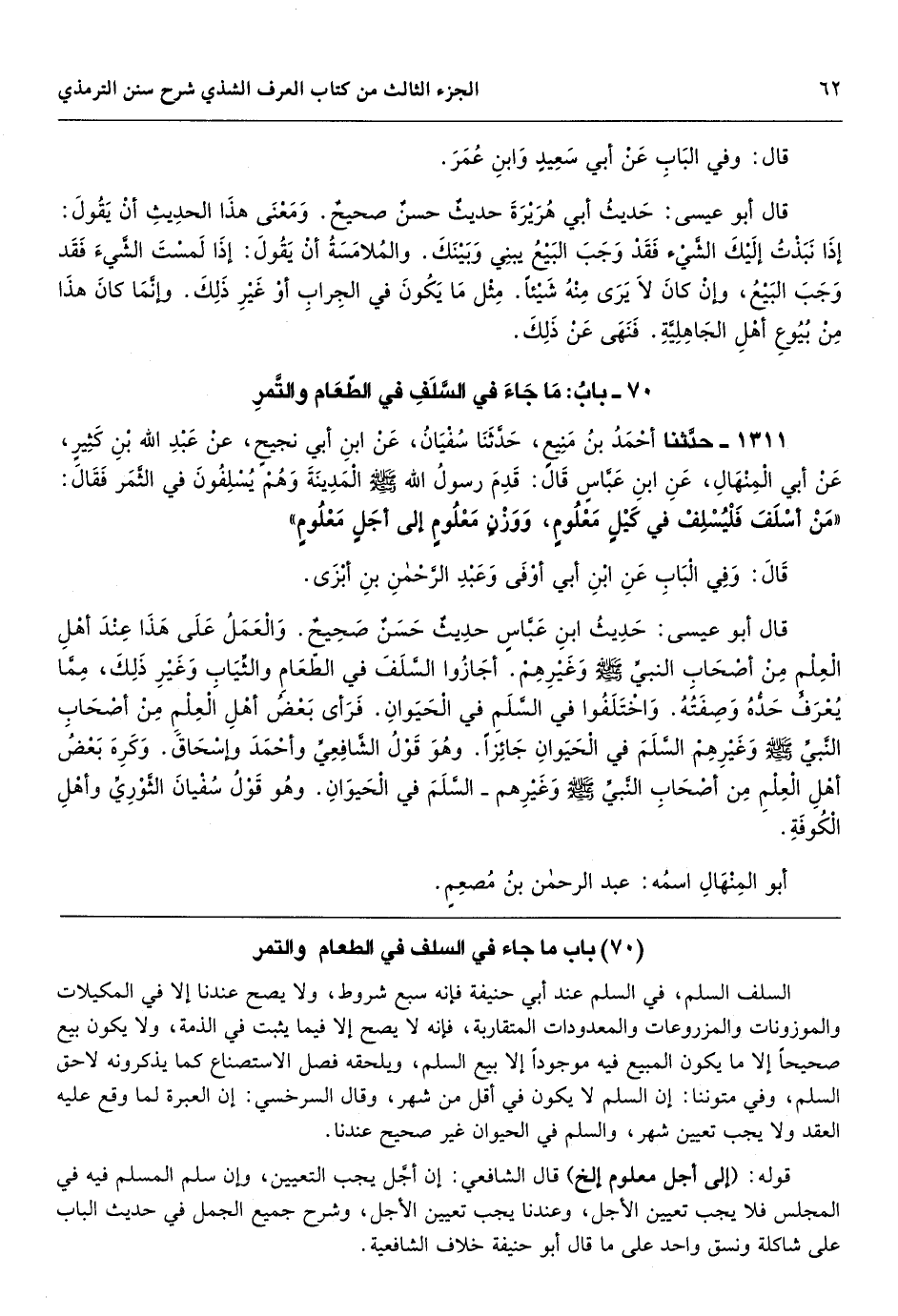 [1311] السلف السلم، في السلم عند أبي حنيفة فإنه سبع شروط، ولا يصح عندنا إلا في المكيلات والموزونات والمزروعات والمعدودات المتقاربة، فإنه لا يصح إلا فيما يثبت في الذمة، ولا يكون بيع صحيحاً إلا ما يكون المبيع فيه موجوداً إلا بيع السلم، ويلحقه فصل الاستصناع كما يذكرونه لاحق السلم، وفي متوننا: إن السلم لا يكون في أقل من شهر، وقال السرخسي: إن العبرة لما وقع عليه العقد ولا يجب تعيين شهر، والسلم في الحيوان غير صحيح عندنا.