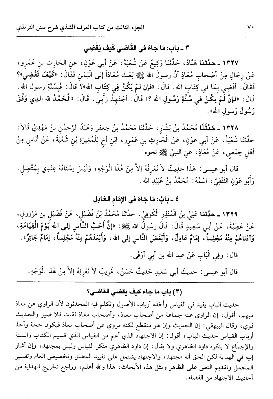 [1327] حديث الباب يفيد في القياس وأخذه أرباب الأصول وتكلم فيه المحدثون لأن الراوي عن معاذ مبهم، أقول: إن الراوي عنه جماعة من أصحاب معاذ، وأصحاب معاذ ثقات فلا ضير والحديث قوي، وقال البيهقي: إن الحديث وإن هو منقطع لكنه مروي عن أصحاب معاذ فيكون حجة وأخذ أرباب القياس حديث الباب، أقول: إن الاجتهاد الذي أعم من القياس الذي قسيم الكتاب والسنة والإجماع لا ينكره داود الظاهري ولا يقال: إن داود الظاهري منكر القياس وليس بمجتهد، وإن أشار إليه في الهداية لكن الحق أنه مجتهد، والاجتهاد يشتمل على تقييد المطلق وتخصيص العام وتفسير المجمل وتقديم النص على الظاهر ومثل هذه الأبحاث، هذا والله أعلم، وراجع تخريج الهداية من أحاديث الاجتهاد من القضاء.