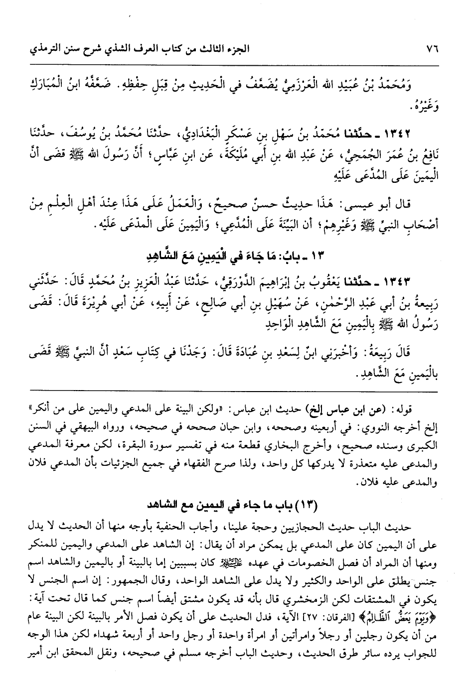 [1343] حديث الباب حديث الحجازيين وحجة علينا، وأجاب الحنفية بأوجه منها أن الحديث لا يدل على أن اليمين كان على المدعي بل يمكن مراد أن يقال: إن الشاهد على المدعي واليمين للمنكر ومنها أن المراد أن فصل الخصومات في عهده كان بسببين إما بالبينة أو باليمين والشاهد اسم جنس يطلق على الواحد والكثير ولا يدل على الشاهد الواحد، وقال الجمهور: إن اسم الجنس لا يكون في المشتقات لكن الزمخشري قال بأنه قد يكون مشتق أيضاً اسم جنس كما قال تحت آية: {وَيَوْمَ يَعَضُّ الظَّالِم} [الفرقان: 27] الآية، فدل الحديث على أن يكون فصل الأمر بالبينة لكن البينة عام من أن يكون رجلين أو رجلاً وامرأتين أو امرأة واحدة أو رجل واحد أو أربعة شهداء لكن هذا الوجه للجواب يرده سائر طرق الحديث، وحديث الباب أخرجه مسلم في صحيحه، ونقل المحقق ابن أمير