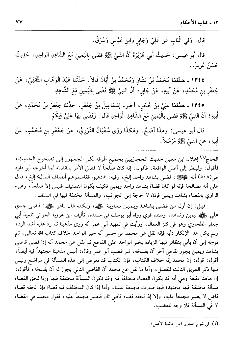 الحاج إعلال ابن معين حديث الحجازيين بجميع طرقه لكن الجمهور إلى تصحيح الحديث، فأقول: ولينظر إلى أصل الواقعة، فأقول: إنه كان صلحاً لا فصل الأمر بالقضاء لما أخرجه أبو داود ص (508) أنه: قضى بشاهد واحد إلخ، وفيه: «اذهبوا فقاسموهم أنصاف المال» إلخ، فدل على أنه مصالحة فإنه لو كان قضاءً بشاهد واحد ويمين فكيف يكون التصنيف فليس إلا صلحاً، وعبره الراوي بالقضاء بشاهد ويمين فإذن لا حاجة إلى الجوانب، والمسألة مختلفة فيها في السلف.