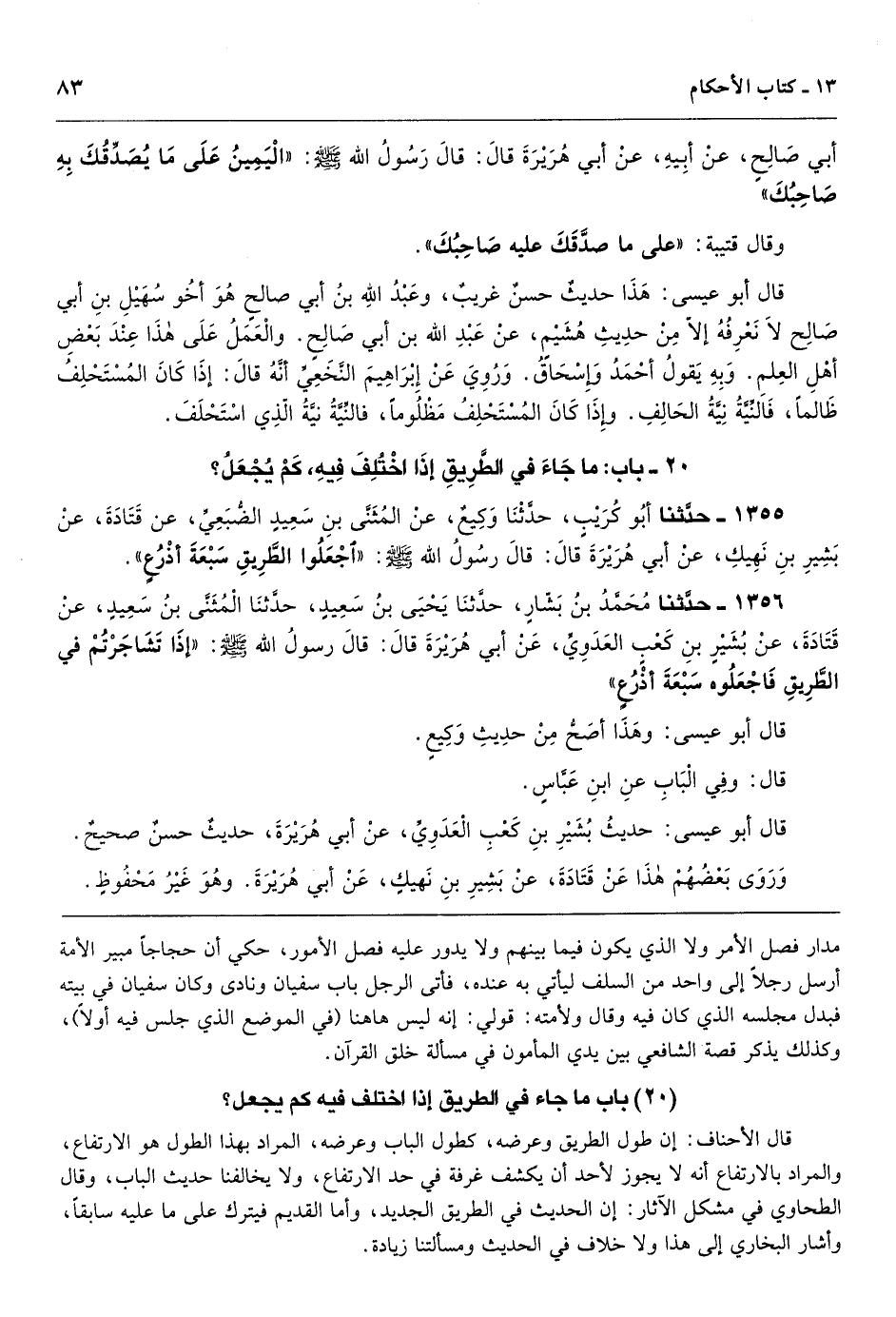 [1355] قال الأحناف: إن طول الطريق وعرضه، كطول الباب وعرضه، المراد بهذا الطول هو الارتفاع، والمراد بالارتفاع أنه لا يجوز لأحد أن يكشف غرفة في حد الارتفاع، ولا يخالفنا حديث الباب، وقال الطحاوي في مشكل الآثار: إن الحديث في الطريق الجديد، وأما القديم فيترك على ما عليه سابقاً، وأشار البخاري إلى هذا ولا خلاف في الحديث ومسألتنا زيادة.