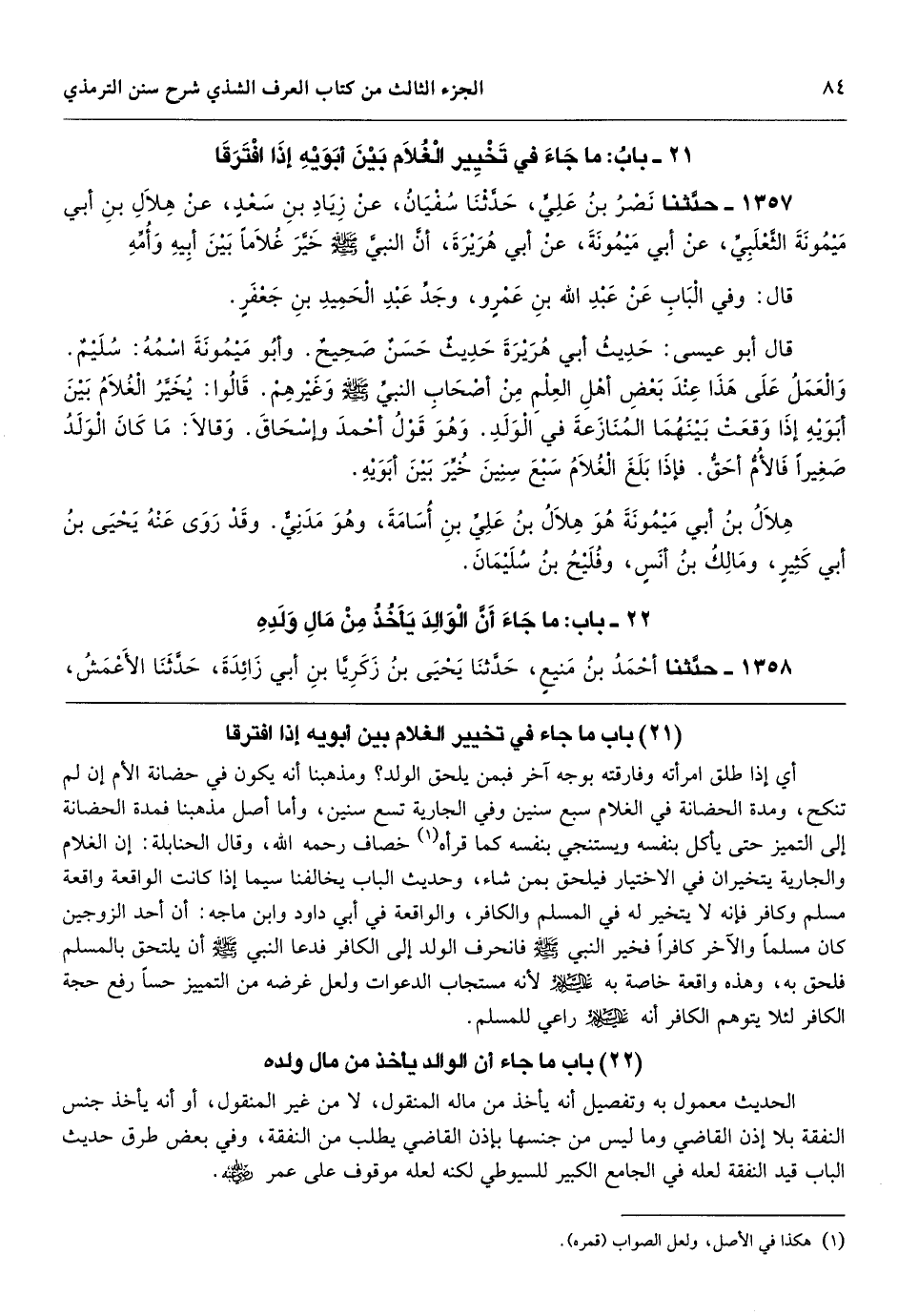 [1357] أي إذا طلق امرأته وفارقته بوجه آخر فبمن يلحق الولد؟ ومذهبنا أنه يكون في حضانة الأم إن لم تنكح، ومدة الحضانة في الغلام سبع سنين وفي الجارية تسع سنين، وأما أصل مذهبنا فمدة الحضانة إلى التميز حتى يأكل بنفسه ويستنجي بنفسه كما قرأه خصاف رحمه الله، وقال الحنابلة: إن الغلام والجارية يتخيران في الاختيار فيلحق بمن شاء، وحديث الباب يخالفنا سيما إذا كانت الواقعة واقعة مسلم وكافر فإنه لا يتخير له في المسلم والكافر، والواقعة في أبي داود وابن ماجه: أن أحد الزوجين كان مسلماً والآخر كافراً فخير النبي - صَلَّى اللهُ عَلَيْهِ وَسَلَّمَ - فانحرف الولد إلى الكافر فدعا النبي - صَلَّى اللهُ عَلَيْهِ وَسَلَّمَ - أن يلتحق بالمسلم فلحق به، وهذه واقعة خاصة به لأنه مستجاب الدعوات ولعل غرضه من التمييز حساً رفع حجة الكافر لئلا يتوهم الكافر أنه راعي للمسلم.