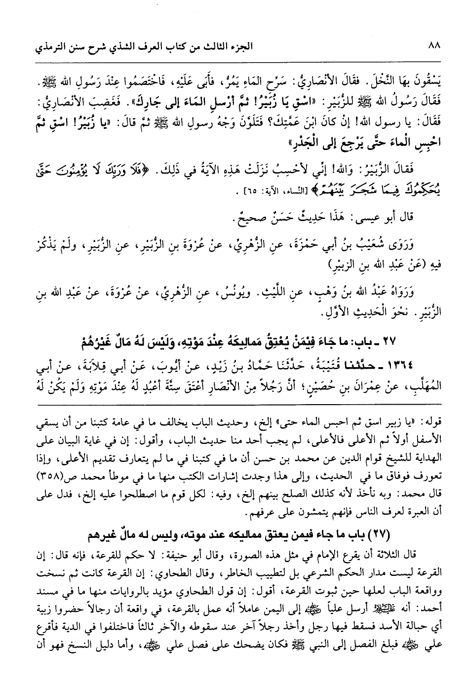 قوله: «يا زبير اسق ثم احبس الماء حتى» إلخ، وحديث الباب يخالف ما في عامة كتبنا من أن يسقي الأسفل أولاً ثم الأعلى فالأعلى، لم يجب أحد منا حديث الباب، وأقول: إن في غاية البيان على الهداية للشيخ قوام الدين عن محمد بن حسن أن ما في كتبنا في ما لم يتعارف تقديم الأعلى، وإذا تعورف فوفاق ما في الحديث، وإلى هذا وجدت إشارات الكتب منها ما في موطأ محمد ص (358) قال محمد: وبه نأخذ لأنه كذلك الصلح بينهم إلخ، وفيه: لكل قوم ما اصطلحوا عليه إلخ، فدل على أن العبرة لعرف الناس فإنهم يتمشون على عرفهم.