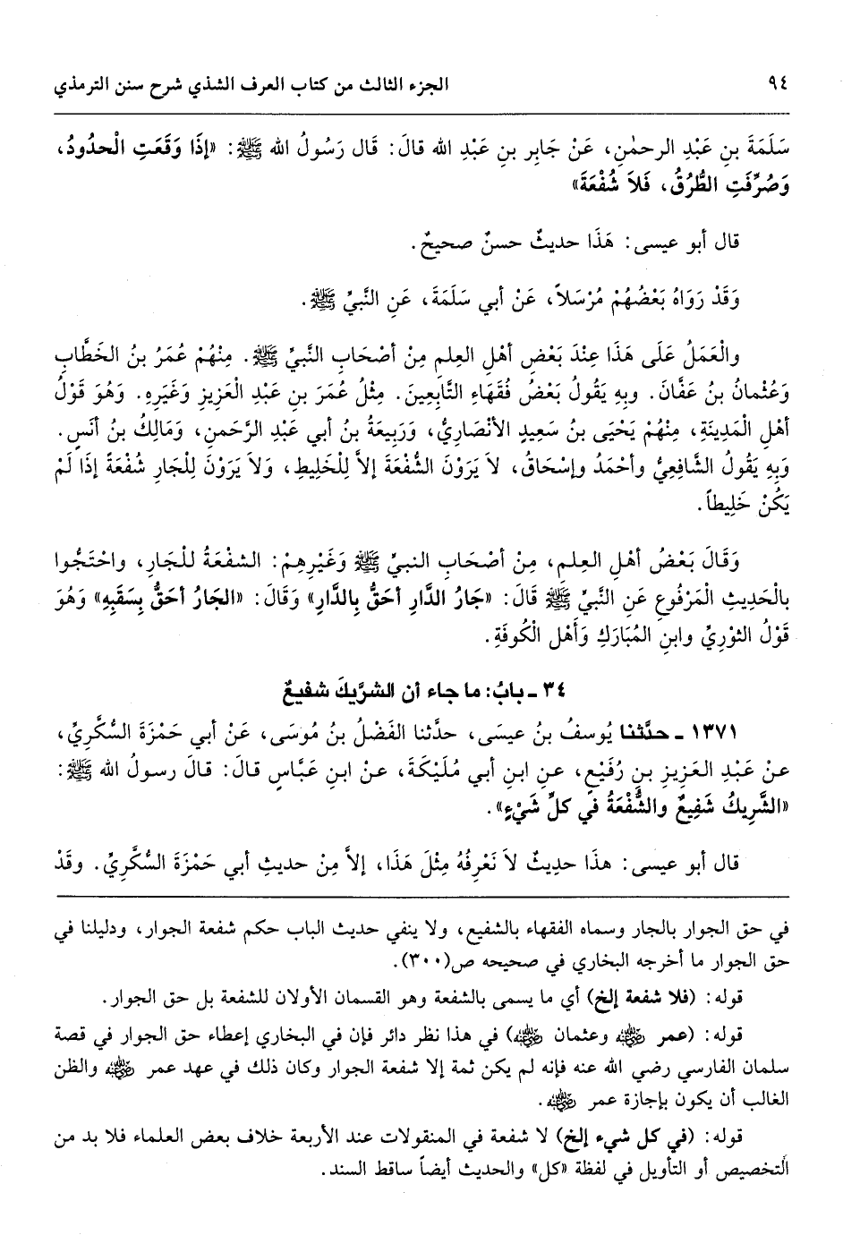 في حق الجوار بالجار وسماه الفقهاء بالشفيع، ولا ينفي حديث الباب حكم شفعة الجوار، ودليلنا في حق الجوار ما أخرجه البخاري في صحيحه ص (300) .