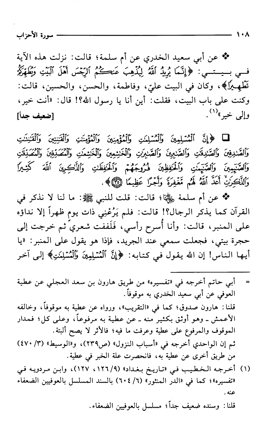* عن أبي سعيد الخدري عن أم سلمة؛ قالت: نزلت هذه الآية في بيتي: {إِنَّمَا يُرِيدُ اللَّهُ لِيُذْهِبَ عَنْكُمُ الرِّجْسَ أَهْلَ الْبَيْتِ وَيُطَهِّرَكُمْ تَطْهِيرًا}، وكان في البيت عليّ، وفاطمة، والحسن، والحسين، قالت: وكنت على باب البيت، فقلت: أين أنا يا رسول الله؟! قال: "أنت خير، وإلى خير" (¬1). [ضعيف جداً]