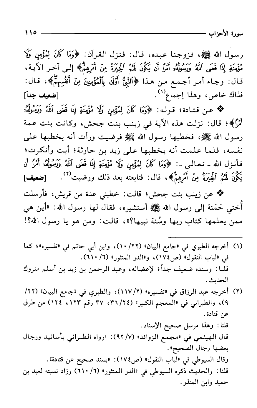 * عن قتادة؛ قوله: {وَمَا كَانَ لِمُؤْمِنٍ وَلَا مُؤْمِنَةٍ إِذَا قَضَى اللَّهُ وَرَسُولُهُ أَمْرًا}؛ قال: نزلت هذه الآية في زينب بنت جحش، وكانت بنت عمة رسول الله - صلى الله عليه وسلم -، فخطبها رسول الله - صلى الله عليه وسلم - فرضيت ورأت أنه يخطبها على نفسه، فلما علمت أنه يخطبها على زيد بن حارثة؛ أبت وأنكرت؛ فأنزل الله -تعالى-: {وَمَا كَانَ لِمُؤْمِنٍ وَلَا مُؤْمِنَةٍ إِذَا قَضَى اللَّهُ وَرَسُولُهُ أَمْرًا أَنْ يَكُونَ لَهُمُ الْخِيَرَةُ مِنْ أَمْرِهِمْ}، قال: فتابعته بعد ذلك ورضيت (¬2). [ضعيف]