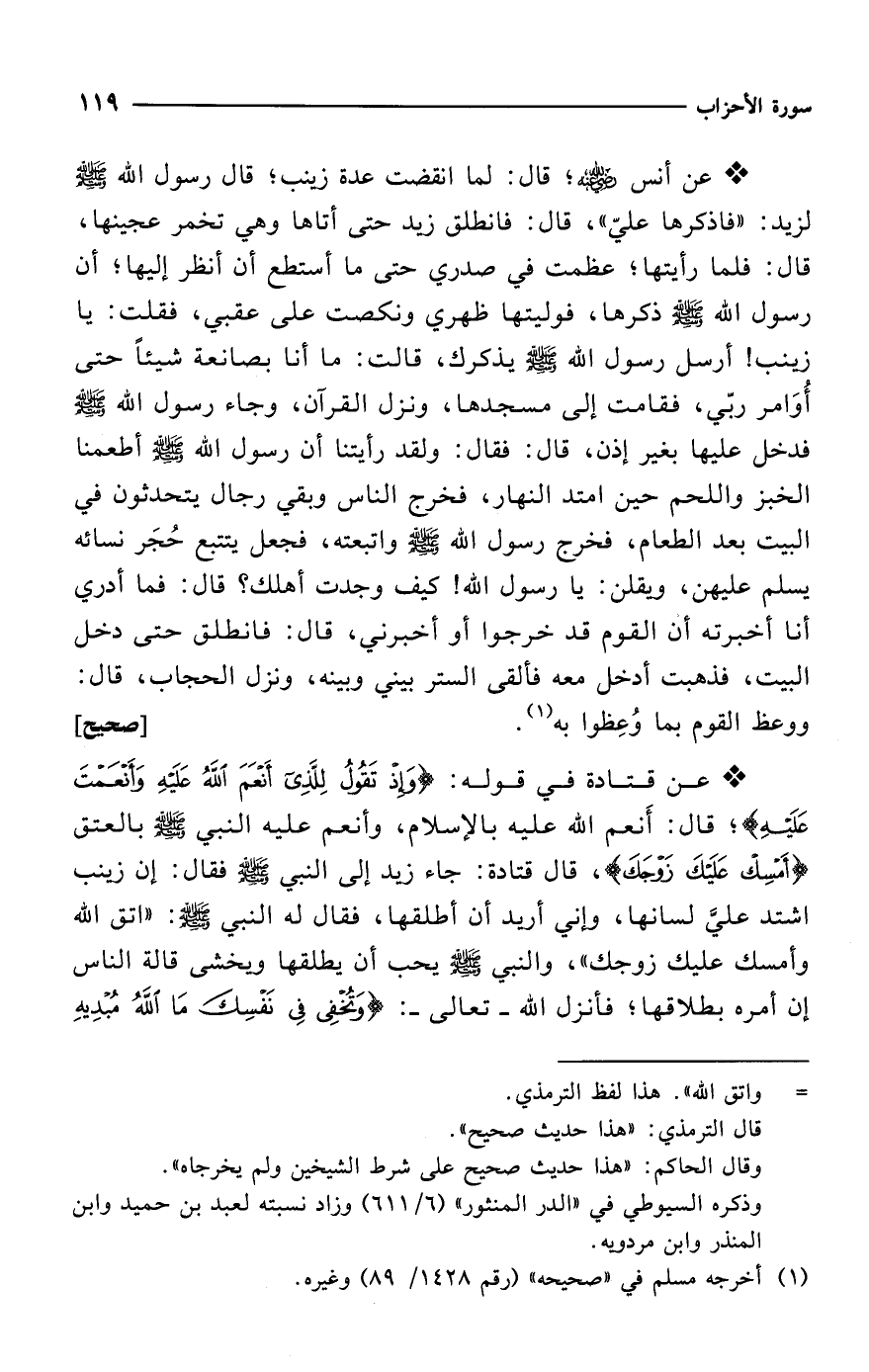 * عن قتادة في قوله: {وَإِذْ تَقُولُ لِلَّذِي أَنْعَمَ اللَّهُ عَلَيْهِ وَأَنْعَمْتَ عَلَيْهِ}؛ قال: أَنعم الله عليه بالإِسلام، وأنعم عليه النبي - صلى الله عليه وسلم - بالعتق {أَمْسِكْ عَلَيْكَ زَوْجَكَ}، قال قتادة: جاء زيد إلى النبي - صلى الله عليه وسلم - فقال: إن زينب اشتد عليَّ لسانها، وإني أريد أن أطلقها، فقال له النبي - صلى الله عليه وسلم -: "اتق الله وأمسك عليك زوجك"، والنبي - صلى الله عليه وسلم - يحب أن يطلقها ويخشى قالة الناس إن أمره بطلاقها؛ فأنزل الله -تعالى-: {وَتُخْفِي فِي نَفْسِكَ مَا اللَّهُ مُبْدِيهِ
