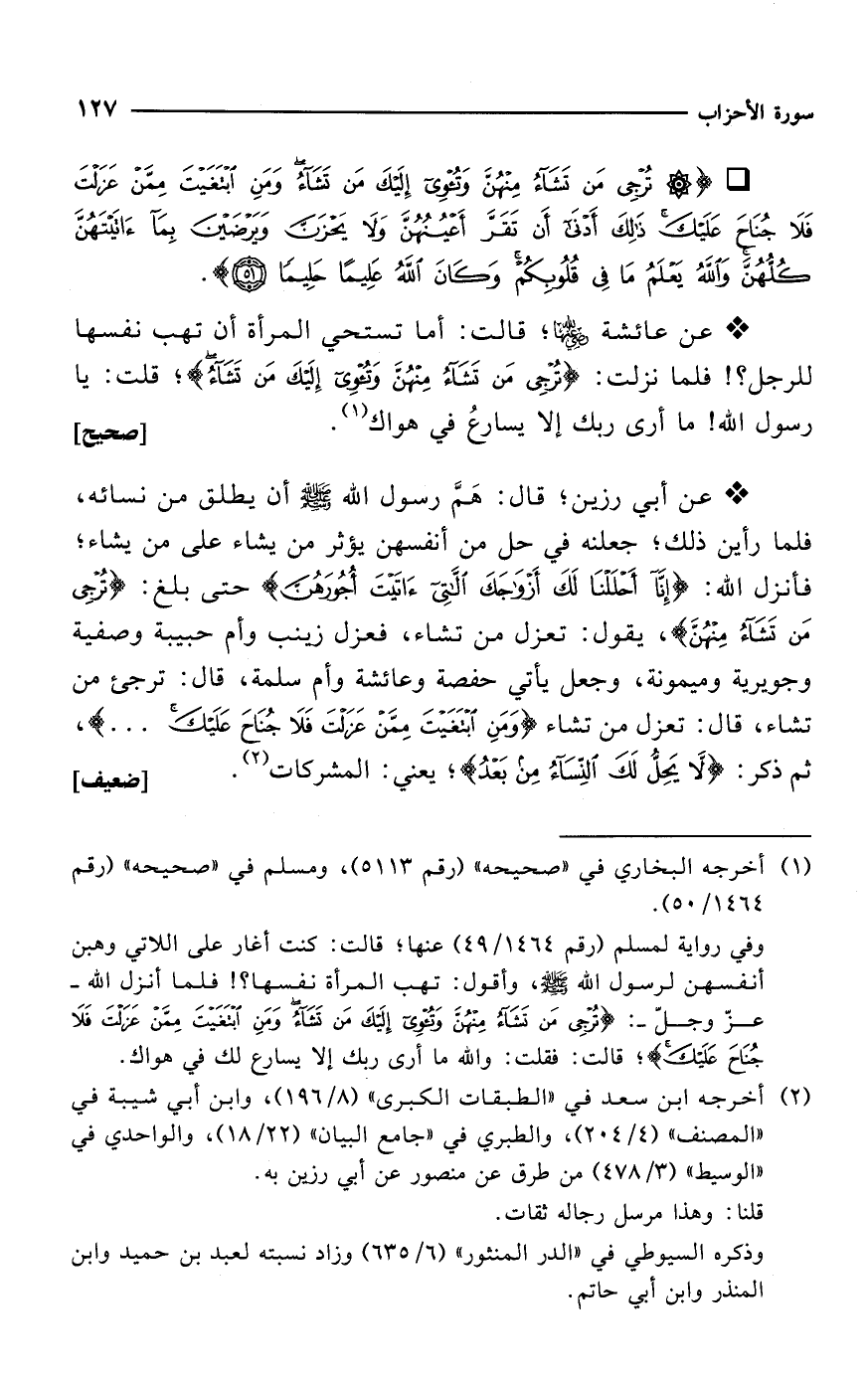 * عن أبي رزين؛ قال: هَمَّ رسول الله - صلى الله عليه وسلم - أن يطلق من نسائه، فلما رأين ذلك؛ جعلنه في حل من أنفسهن يؤثر من يشاء على من يشاء؛ فأنزل الله: {إِنَّا أَحْلَلْنَا لَكَ أَزْوَاجَكَ اللَّاتِي آتَيْتَ أُجُورَهُنَّ} حتى بلغ: {تُرْجِي مَنْ تَشَاءُ مِنْهُنَّ}، يقول: تعزل من تشاء، فعزل زينب وأم حبيبة وصفية وجويرية وميمونة، وجعل يأتي حفصة وعائشة وأم سلمة، قال: ترجئ من تشاء، قال: تعزل من تشاء {وَمَنِ ابْتَغَيْتَ مِمَّنْ عَزَلْتَ فَلَا جُنَاحَ عَلَيْكَ. . .}، ثم ذكر: {لَا يَحِلُّ لَكَ النِّسَاءُ مِنْ بَعْدُ}؛ يعني: المشركات (¬2). [ضعيف]