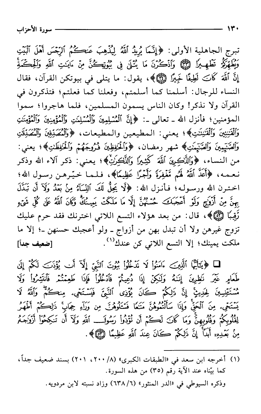 تبرج الجاهلية الأولى: {إِنَّمَا يُرِيدُ اللَّهُ لِيُذْهِبَ عَنْكُمُ الرِّجْسَ أَهْلَ الْبَيْتِ وَيُطَهِّرَكُمْ تَطْهِيرًا (33) وَاذْكُرْنَ مَا يُتْلَى فِي بُيُوتِكُنَّ مِنْ آيَاتِ اللَّهِ وَالْحِكْمَةِ إِنَّ اللَّهَ كَانَ لَطِيفًا خَبِيرًا (34)}، يقول: ما يتلى في بيوتكن القرآن، فقال النساء للرجال: أسلمنا كما أسلمتم، وفعلنا كما فعلتم؛ فتذكرون في القرآن ولا نذكر! وكان الناس يسمون المسلمين، فلما هاجروا؛ سموا المؤمنين؛ فأنزل الله -تعالى-: {إِنَّ الْمُسْلِمِينَ وَالْمُسْلِمَاتِ وَالْمُؤْمِنِينَ وَالْمُؤْمِنَاتِ وَالْقَانِتِينَ وَالْقَانِتَاتِ}؛ يعني: المطيعين والمطيعات، {وَالْمُتَصَدِّقِينَ وَالْمُتَصَدِّقَاتِ وَالصَّائِمِينَ وَالصَّائِمَاتِ} شهر رمضان، {وَالْحَافِظِينَ فُرُوجَهُمْ وَالْحَافِظَاتِ}؛ يعني: من النساء، {وَالذَّاكِرِينَ اللَّهَ كَثِيرًا وَالذَّاكِرَاتِ}؛ يعني: ذكر آلاء الله وذكر نعمه، {أَعَدَّ اللَّهُ لَهُمْ مَغْفِرَةً وَأَجْرًا عَظِيمًا}، فلما خيّرهن رسول الله؛ اخترن الله ورسوله؛ فأنزل الله: {لَا يَحِلُّ لَكَ النِّسَاءُ مِنْ بَعْدُ وَلَا أَنْ تَبَدَّلَ بِهِنَّ مِنْ أَزْوَاجٍ وَلَوْ أَعْجَبَكَ حُسْنُهُنَّ إِلَّا مَا مَلَكَتْ يَمِينُكَ وَكَانَ اللَّهُ عَلَى كُلِّ شَيْءٍ رَقِيبًا (52)}، قال: من بعد هؤلاء التسع اللاتي اخترنك فقد حرم عليك تزوج غيرهن ولا أن تبدل بهن من أزواج -ولو أعجبك حسنهن-؛ إلا ما ملكت يمينك؛ إلا التسع اللاتي كن عندك (¬1). [ضعيف جداً]