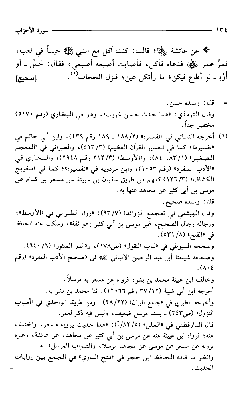 (¬1) أخرجه النسائي في "تفسيره" (2/ 188 - 189 رقم 439)، وابن أبي حاتم في "تفسيره"؛ كما في "تفسير القرآن العظيم" (3/ 513)، والطبراني في "المعجم الصغير" (1/ 83، 84)، و"الأوسط" (3/ 212 رقم 2948)، والبخاري في "الأدب المفرد" (رقم 1053)، وابن مردويه في "تفسيره"؛ كما في "تخريج الكشاف" (3/ 126) كلهم من طريق سفيان بن عيينة عن مسعر بن كدام عن موسى بن أبي كثير عن مجاهد عنها به.