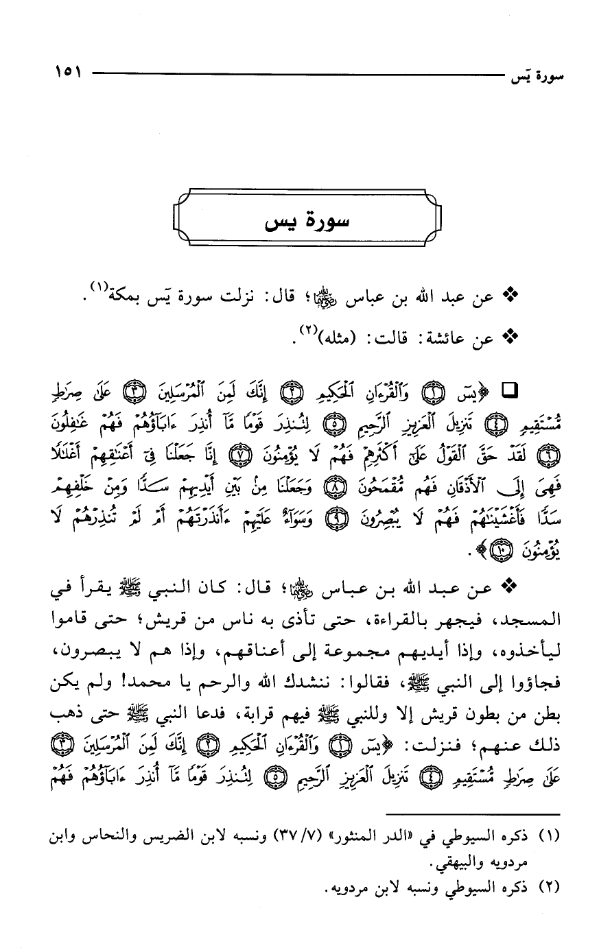 * عن عبد الله بن عباس -رضي الله عنهما-؛ قال: كان النبي - صلى الله عليه وسلم - يقرأ في المسجد، فيجهر بالقراءة، حتى تأذى به ناس من قريش؛ حتى قاموا ليأخذوه، وإذا أيديهم مجموعة إلى أعناقهم، وإذا هم لا يبصرون، فجاؤوا إلى النبي - صلى الله عليه وسلم -، فقالوا: ننشدك الله والرحم يا محمد! ولم يكن بطن من بطون قريش إلا وللنبي - صلى الله عليه وسلم - فيهم قرابة، فدعا النبي - صلى الله عليه وسلم - حتى ذهب ذلك عنهم؛ فنزلت: {يس (1) وَالْقُرْآنِ الْحَكِيمِ (2) إِنَّكَ لَمِنَ الْمُرْسَلِينَ (3) عَلَى صِرَاطٍ مُسْتَقِيمٍ (4) تَنْزِيلَ الْعَزِيزِ الرَّحِيمِ (5) لِتُنْذِرَ قَوْمًا مَا أُنْذِرَ آبَاؤُهُمْ فَهُمْ