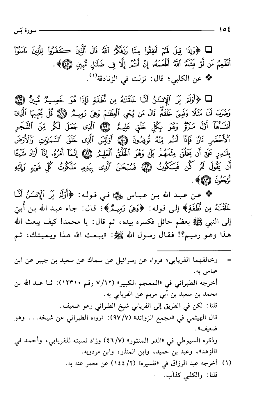 * عن عبد الله بن عباس -رضي الله عنهما- في قوله: {أَوَلَمْ يَرَ الْإِنْسَانُ أَنَّا خَلَقْنَاهُ مِنْ نُطْفَةٍ} إلى قوله: {وَهِيَ رَمِيمٌ}؛ قال: جاء عبد الله بن أُبيّ إلى النبي - صلى الله عليه وسلم - بعظم حائل فكسره بيده، ثم قال: يا محمد! كيف يبعث الله هذا وهو رميم؟! فقال رسول الله - صلى الله عليه وسلم -: "يبعث الله هذا ويميتك، ثم