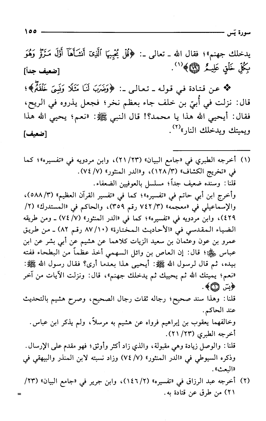 * عن قتادة في قوله -تعالى-: {وَضَرَبَ لَنَا مَثَلًا وَنَسِيَ خَلْقَهُ}؛ قال: نزلت في أُبيّ بن خلف جاء بعظم نخر؛ فجعل يذروه في الريح، فقال: أيحيي الله هذا يا محمد؟! قال النبي - صلى الله عليه وسلم -: "نعم؛ يحيي الله هذا ويميتك ويدخلك النار" (¬2). [ضعيف]