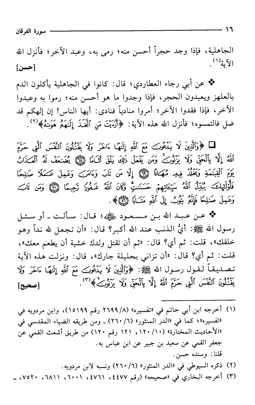 * عن عبد الله بن مسعود -رضي الله عنه-؛ قال: سألت -أو سئل- رسول الله - صلى الله عليه وسلم -: أيُّ الذنب عند الله أكبر؟ قال: "أن تجعل لله نداً وهو خلقك"، قلت: ثم أي؟ قال: "ثم أن تقتل ولدك خشية أن يطعم معك"، قلت: ثم أي؟ قال: "أن تزاني بحليلة جارك"، قال: ونزلت هذه الآية تصديقاً لقول رسول الله - صلى الله عليه وسلم -: {وَالَّذِينَ لَا يَدْعُونَ مَعَ اللَّهِ إِلَهًا آخَرَ وَلَا يَقْتُلُونَ النَّفْسَ الَّتِي حَرَّمَ اللَّهُ إِلَّا بِالْحَقِّ وَلَا يَزْنُونَ} (¬3). [صحيح]