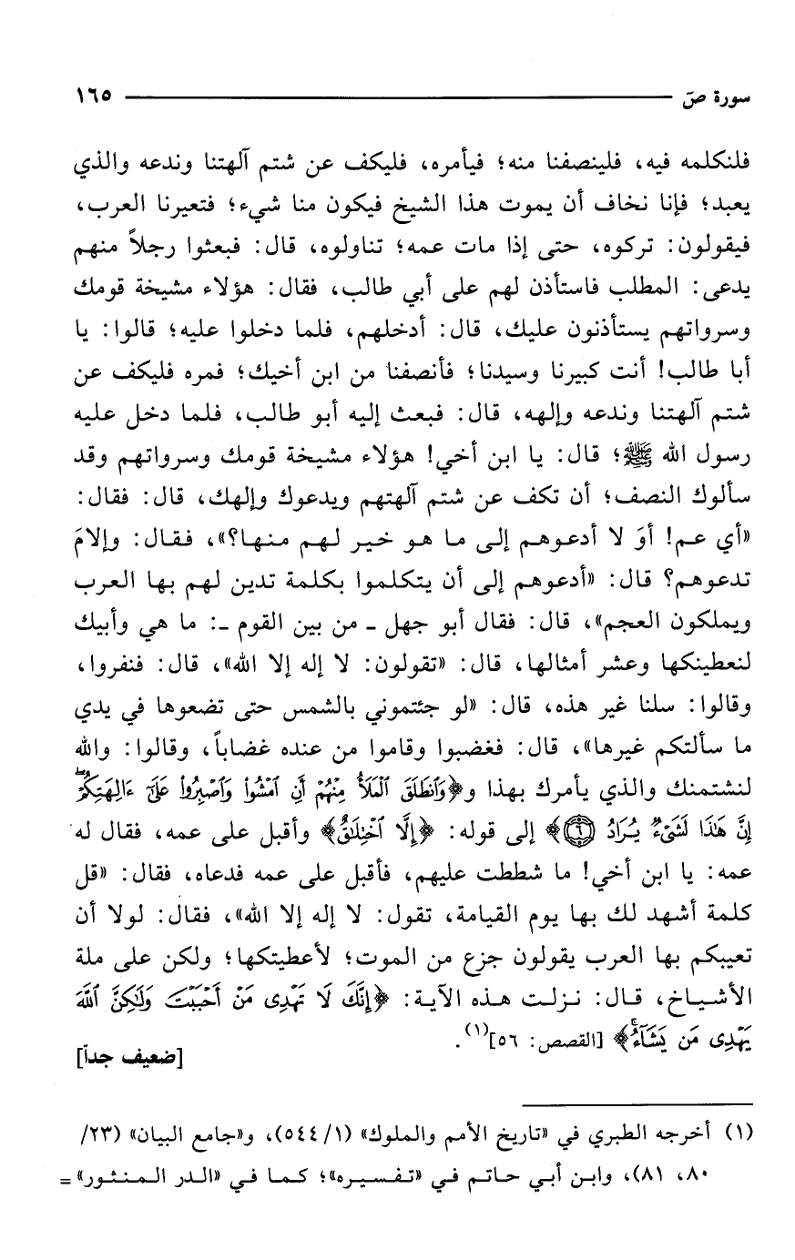 فلنكلمه فيه، فلينصفنا منه؛ فيأمره، فليكف عن شتم آلهتنا وندعه والذي يعبد؛ فإنا نخاف أن يموت هذا الشيخ فيكون منا شيء؛ فتعيرنا العرب، فيقولون: تركوه، حتى إذا مات عمه؛ تناولوه، قال: فبعثوا رجلاً منهم يدعى: المطلب فاستأذن لهم على أبي طالب، فقال: هؤلاء مشيخة قومك وسرواتهم يستأذنون عليك، قال: أدخلهم، فلما دخلوا عليه؛ قالوا: يا أبا طالب! أنت كبيرنا وسيدنا؛ فأنصفنا من ابن أخيك؛ فمره فليكف عن شتم آلهتنا وندعه وإلهه، قال: فبعث إليه أبو طالب، فلما دخل عليه رسول الله - صلى الله عليه وسلم -؛ قال: يا ابن أخي! هؤلاء مشيخة قومك وسرواتهم وقد سألوك النصف؛ أن تكف عن شتم آلهتهم ويدعوك وإلهك، قال: فقال: "أي عم! أوَ لا أدعوهم إلى ما هو خير لهم منها؟ "، فقال: وإلامَ تدعوهم؟ قال: "أدعوهم إلى أن يتكلموا بكلمة تدين لهم بها العرب ويملكون العجم"، قال: فقال أبو جهل -من بين القوم-: ما هي وأبيك لنعطينكها وعشر أمثالها، قال: "تقولون: لا إله إلا الله"، قال: فنفروا، وقالوا: سلنا غير هذه، قال: "لو جئتموني بالشمس حتى تضعوها في يدي ما سألتكم غيرها"، قال: فغضبوا وقاموا من عنده غضاباً، وقالوا: والله لنشتمنك والذي يأمرك بهذا و {وَانْطَلَقَ الْمَلَأُ مِنْهُمْ أَنِ امْشُوا وَاصْبِرُوا عَلَى آلِهَتِكُمْ إِنَّ هَذَا لَشَيْءٌ يُرَادُ (6)} إلى قوله: {إِلَّا اخْتِلَاقٌ} وأقبل على عمه، فقال له عمه: يا ابن أخي! ما شططت عليهم، فأقبل على عمه فدعاه، فقال: "قل كلمة أشهد لك بها يوم القيامة، تقول: لا إله إلا الله"، فقال: لولا أن تعيبكم بها العرب يقولون جزع من الموت؛ لأعطيتكها؛ ولكن على ملة الأشياخ، قال: نزلت هذه الآية: {إِنَّكَ لَا تَهْدِي مَنْ أَحْبَبْتَ وَلَكِنَّ اللَّهَ يَهْدِي مَنْ يَشَاءُ} [القصص: 56] (¬1). [ضعيف جداً]