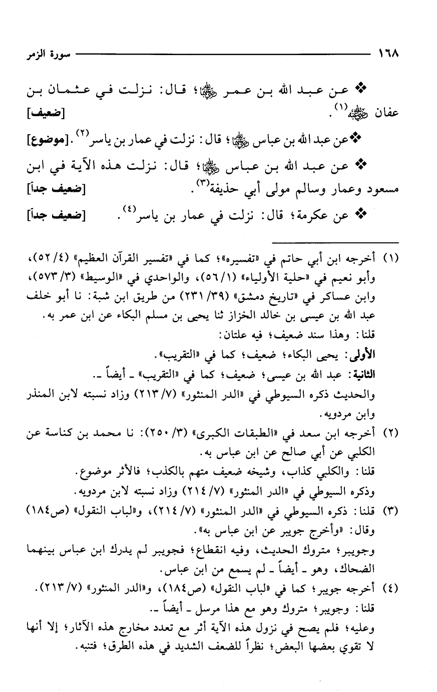 * عن عبد الله بن عباس -رضي الله عنهما-؛ قال: نزلت في عمار بن ياسر (¬2). [موضوع]