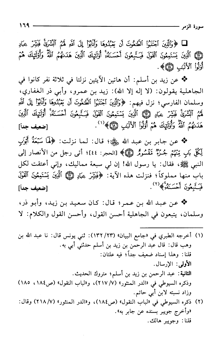 * عن زيد بن أسلم: أن هاتين الآيتين نزلتا في ثلاثة نفر كانوا في الجاهلية يقولون: (لا إله إلا الله): زيد بن عمرو، وأبي ذر الغفاري، وسلمان الفارسي؛ نزل فيهم: {وَالَّذِينَ اجْتَنَبُوا الطَّاغُوتَ أَنْ يَعْبُدُوهَا وَأَنَابُوا إِلَى اللَّهِ لَهُمُ الْبُشْرَى فَبَشِّرْ عِبَادِ (17) الَّذِينَ يَسْتَمِعُونَ الْقَوْلَ فَيَتَّبِعُونَ أَحْسَنَهُ أُولَئِكَ الَّذِينَ هَدَاهُمُ اللَّهُ وَأُولَئِكَ هُمْ أُولُو الْأَلْبَابِ (18)} (¬1). [ضعيف جداً]