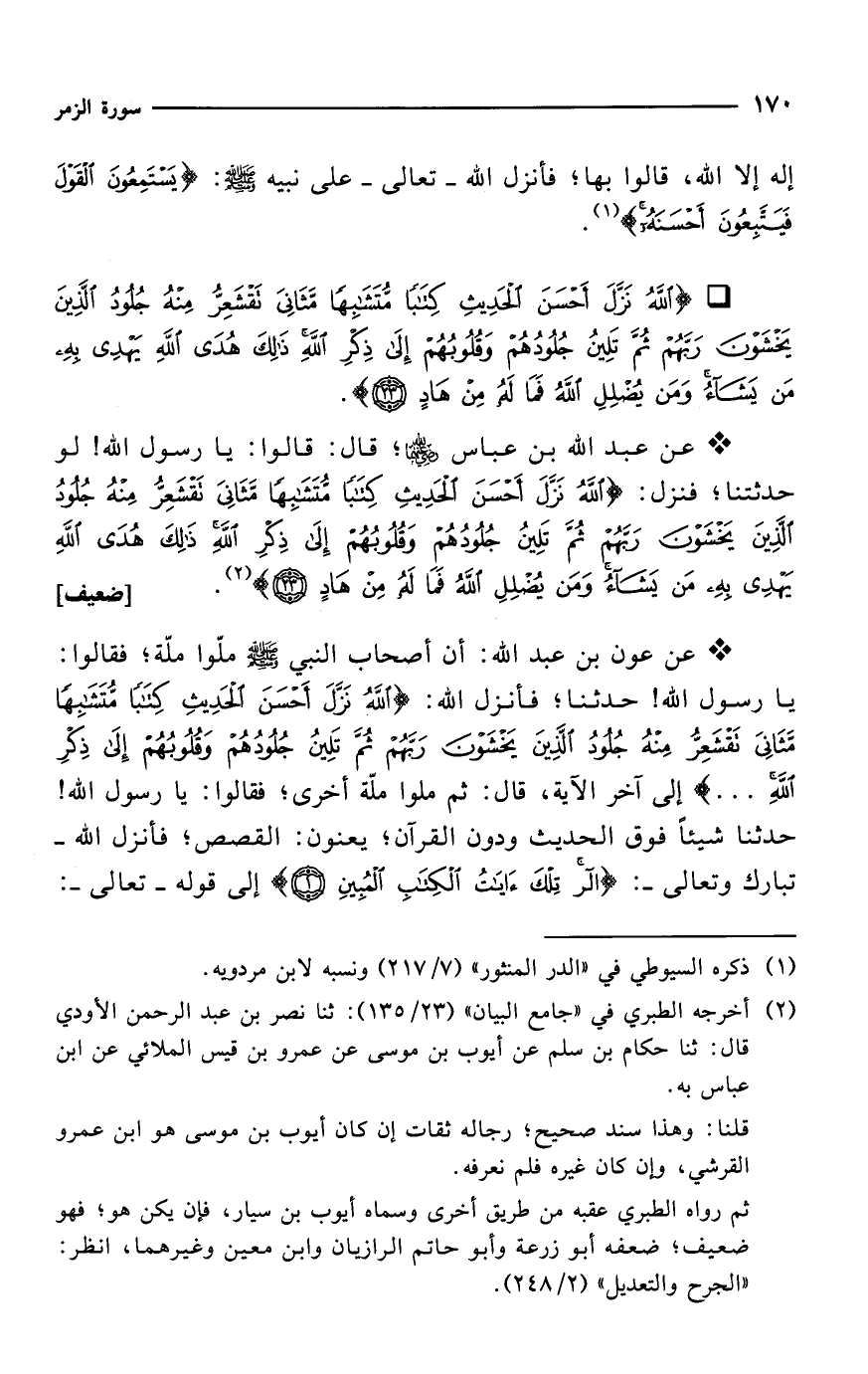 * عن عبد الله بن عباس -رضي الله عنهما-؛ قال: قالوا: يا رسول الله! لو حدثتنا؛ فنزل: {اللَّهُ نَزَّلَ أَحْسَنَ الْحَدِيثِ كِتَابًا مُتَشَابِهًا مَثَانِيَ تَقْشَعِرُّ مِنْهُ جُلُودُ الَّذِينَ يَخْشَوْنَ رَبَّهُمْ ثُمَّ تَلِينُ جُلُودُهُمْ وَقُلُوبُهُمْ إِلَى ذِكْرِ اللَّهِ ذَلِكَ هُدَى اللَّهِ يَهْدِي بِهِ مَنْ يَشَاءُ وَمَنْ يُضْلِلِ اللَّهُ فَمَا لَهُ مِنْ هَادٍ (23)} (¬2). [ضعيف]