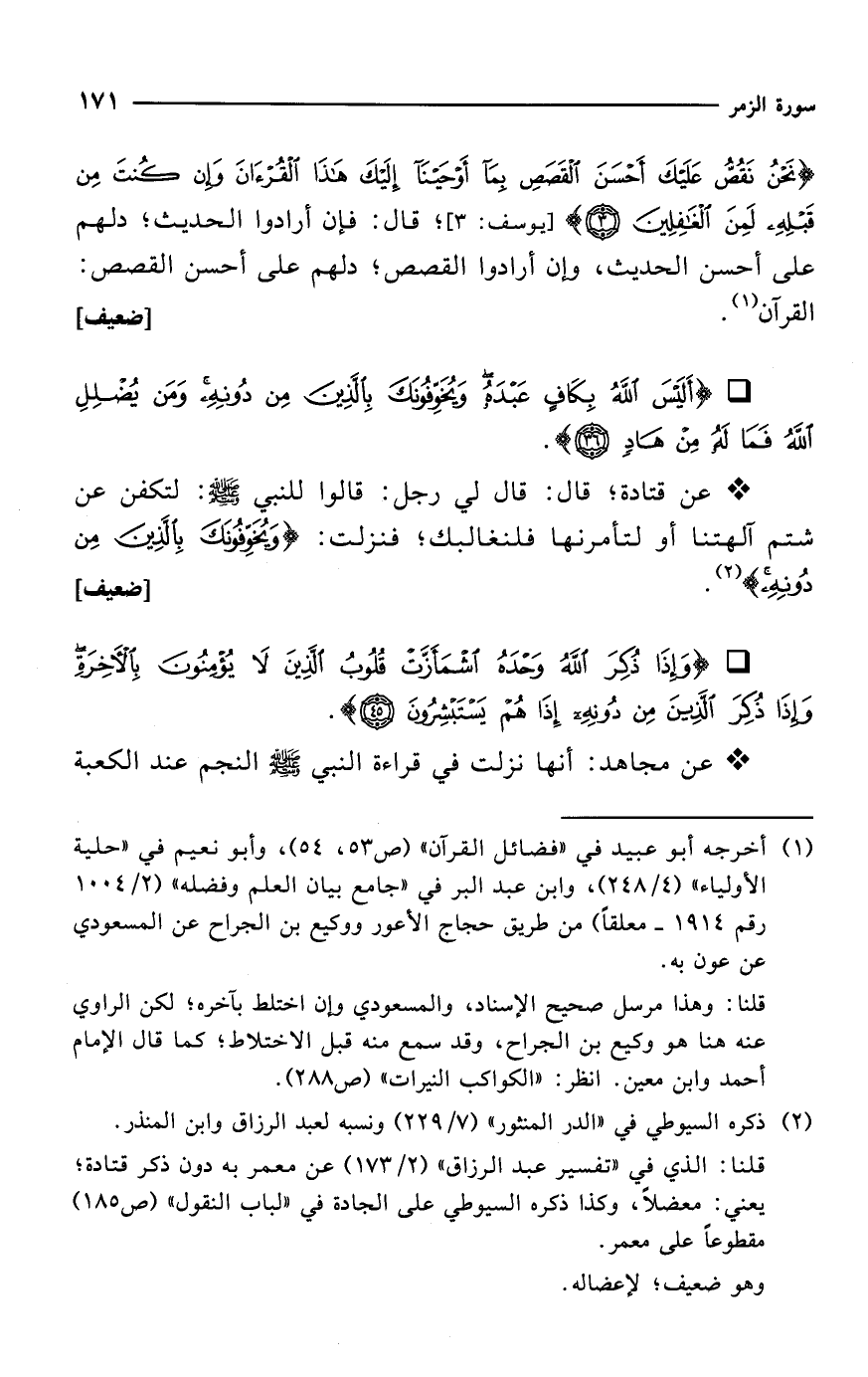 * عن قتادة؛ قال: قال لي رجل: قالوا للنبي - صلى الله عليه وسلم -: لتكفن عن شتم آلهتنا أو لتأمرنها فلنغالبك؛ فنزلت: {وَيُخَوِّفُونَكَ بِالَّذِينَ مِنْ دُونِهِ} (¬2). [ضعيف]