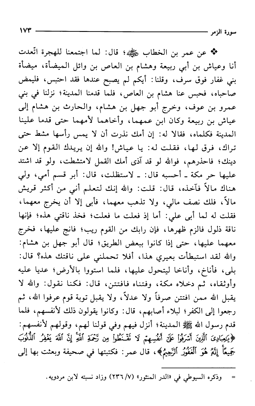 * عن عمر بن الخطاب -رضي الله عنه-؛ قال: لما اجتمعنا للهجرة اتّعدت أنا وعياش بن أبي ربيعة وهشام بن العاص بن وائل الميضأة، ميضأة بني غفار فوق سرف، وقلنا: أيكم لم يصبح عندها فقد احتبس، فليمض صاحباه، فحبس عنا هشام بن العاص، فلما قدمنا المدينة؛ نزلنا في بني عمرو بن عوف، وخرج أبو جهل بن هشام، والحارث بن هشام إلى عياش بن ربيعة وكان ابن عمهما، وأخاهما لأمهما حتى قدما علينا المدينة فكلماه، فقالا له: إن أمك نذرت أن لا يمس رأسها مشط حتى تراك، فرق لها، فقلت له: يا عياش! والله إن يريدك القوم إلا عن دينك؛ فاحذرهم، فوالله لو قد آذى أمك القمل لامتشطت، ولو قد اشتد عليها حر مكة -أحسبه قال:- لاستظلت، قال: أبر قسم أمي، ولي هناك مالاً فآخذه، قال: قلت: والله إنك لتعلم أني من أكثر قريش مالاً، ذلك نصف مالي، ولا تذهب معهما، فأبى إلا أن يخرج معهما، فقلت له لما أبى علي: أما إذ فعلت ما فعلت؛ فخذ ناقتي هذه؛ فإنها ناقة ذلول فالزم ظهرها، فإن رابك من القوم ريب؛ فانج عليها، فخرج معهما عليها، حتى إذا كانوا ببعض الطريق؛ قال أبو جهل بن هشام: والله لقد استبطأت بعيري هذا، أفلا تحملني على ناقتك هذه؟ قال: بلى، فأناخ، وأناخا ليتحول عليها، فلما استووا بالأرض؛ عديا عليه وأوثقاه، ثم دخلاه مكة، وفتناه فافتتن، قال: فكنا نقول: والله لا يقبل الله ممن افتتن صرفاً ولا عدلاً، ولا يقبل توبة قوم عرفوا الله، ثم رجعوا إلى الكفر؛ لبلاء أصابهم، قال: وكانوا يقولون ذلك لأنفسهم، فلما قدم رسول الله - صلى الله عليه وسلم - المدينة؛ أنزل فيهم وفي قولنا لهم، وقولهم لأنفسهم: {يَاعِبَادِيَ الَّذِينَ أَسْرَفُوا عَلَى أَنْفُسِهِمْ لَا تَقْنَطُوا مِنْ رَحْمَةِ اللَّهِ إِنَّ اللَّهَ يَغْفِرُ الذُّنُوبَ جَمِيعًا إِنَّهُ هُوَ الْغَفُورُ الرَّحِيمُ}، قال عمر: فكتبتها في صحيفة وبعثت بها إلى
